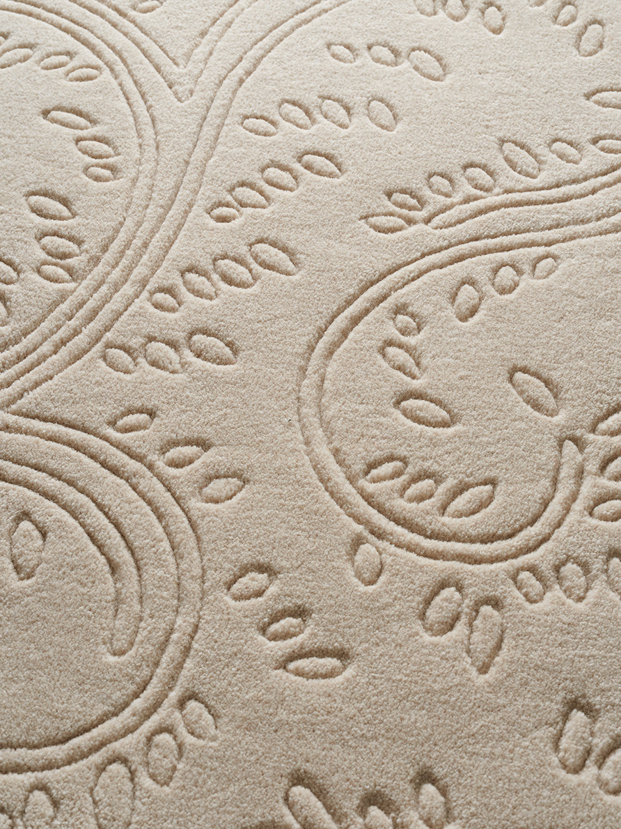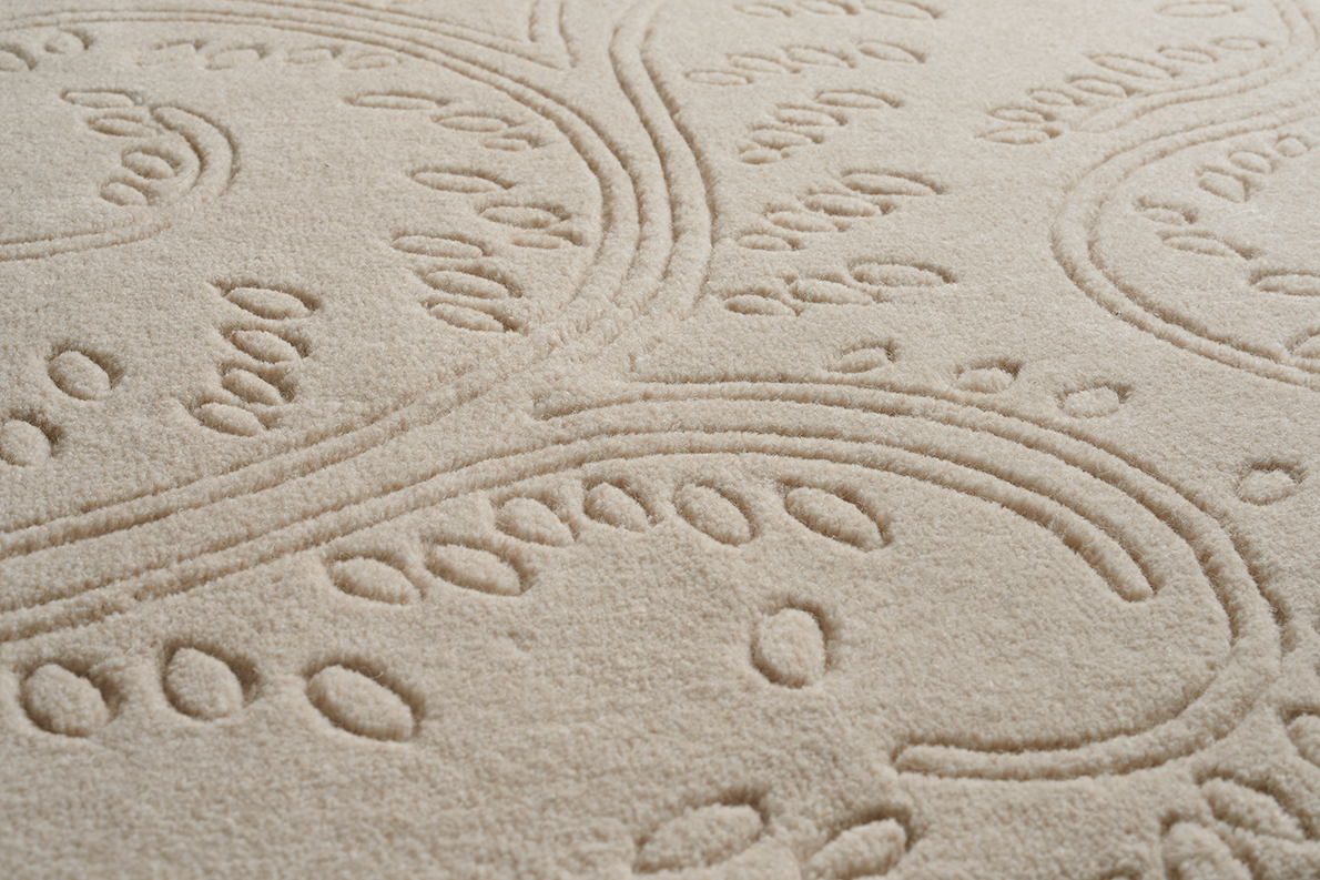 Entirely carved by hand, this drawing is an interpretation of a background from one of our archives. In their Braquenié style, these curves beautifully enhance the finesse of our semi-worsted wool.
