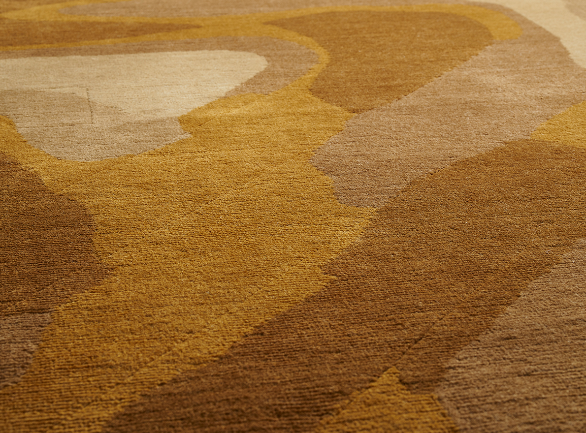 Entirely made of cashmere, this geometric pattern evokes a structured composition of Chinese embroidery. Like a watercolor painting, the colors do not respect the outlines of the pattern, which are revealed and accentuated by carving. Traditionaly hand-knotted in Nepal.