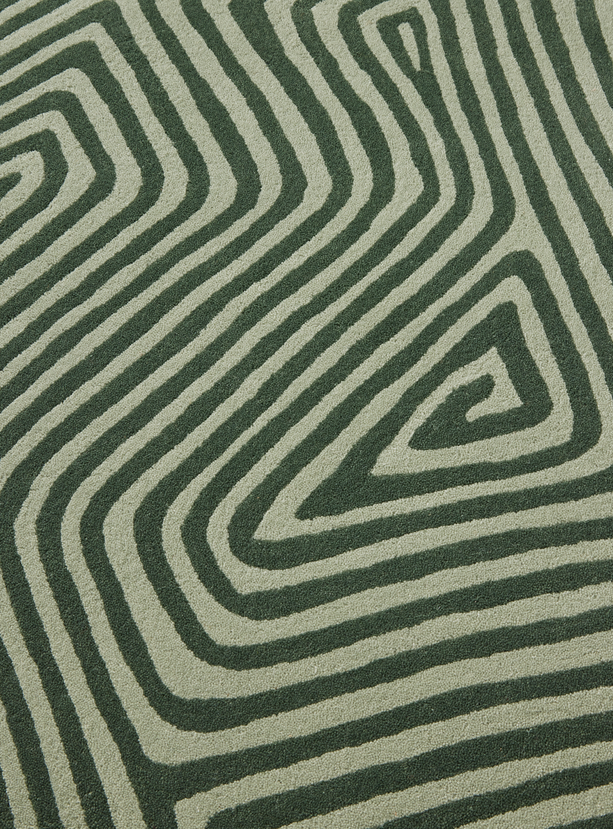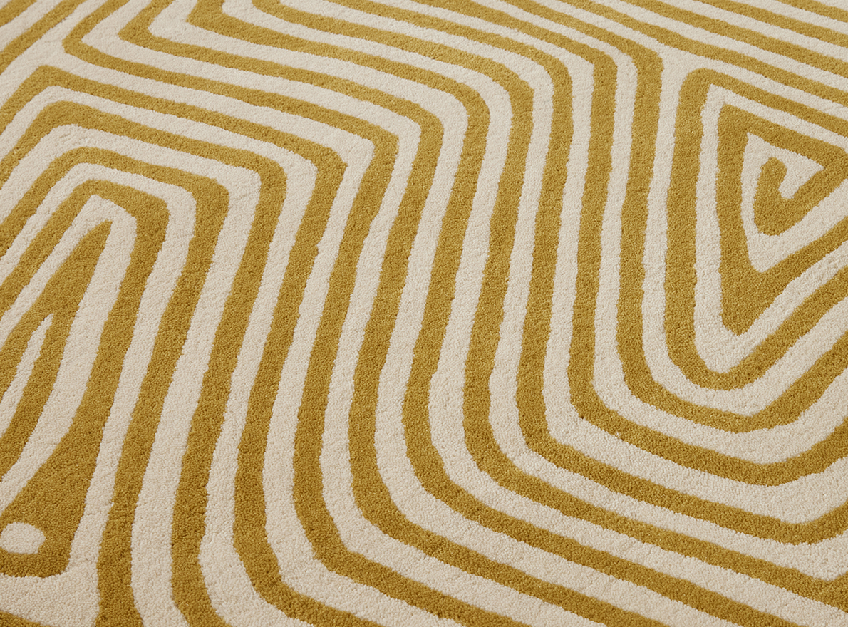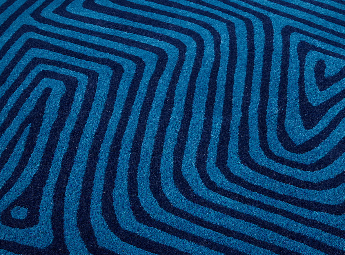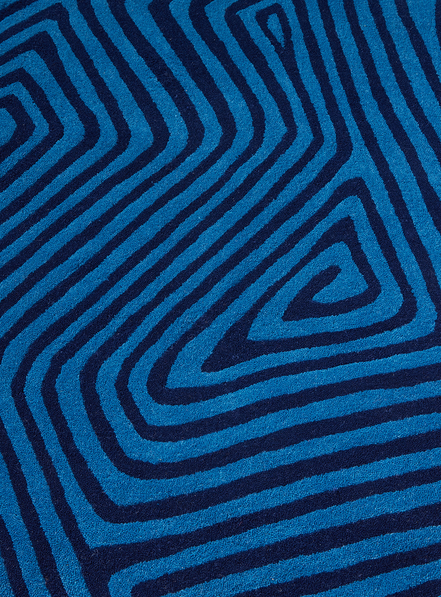 This pattern evokes the sand paintings of Aboriginal art. Hand-tufted with New Zealand wool.
