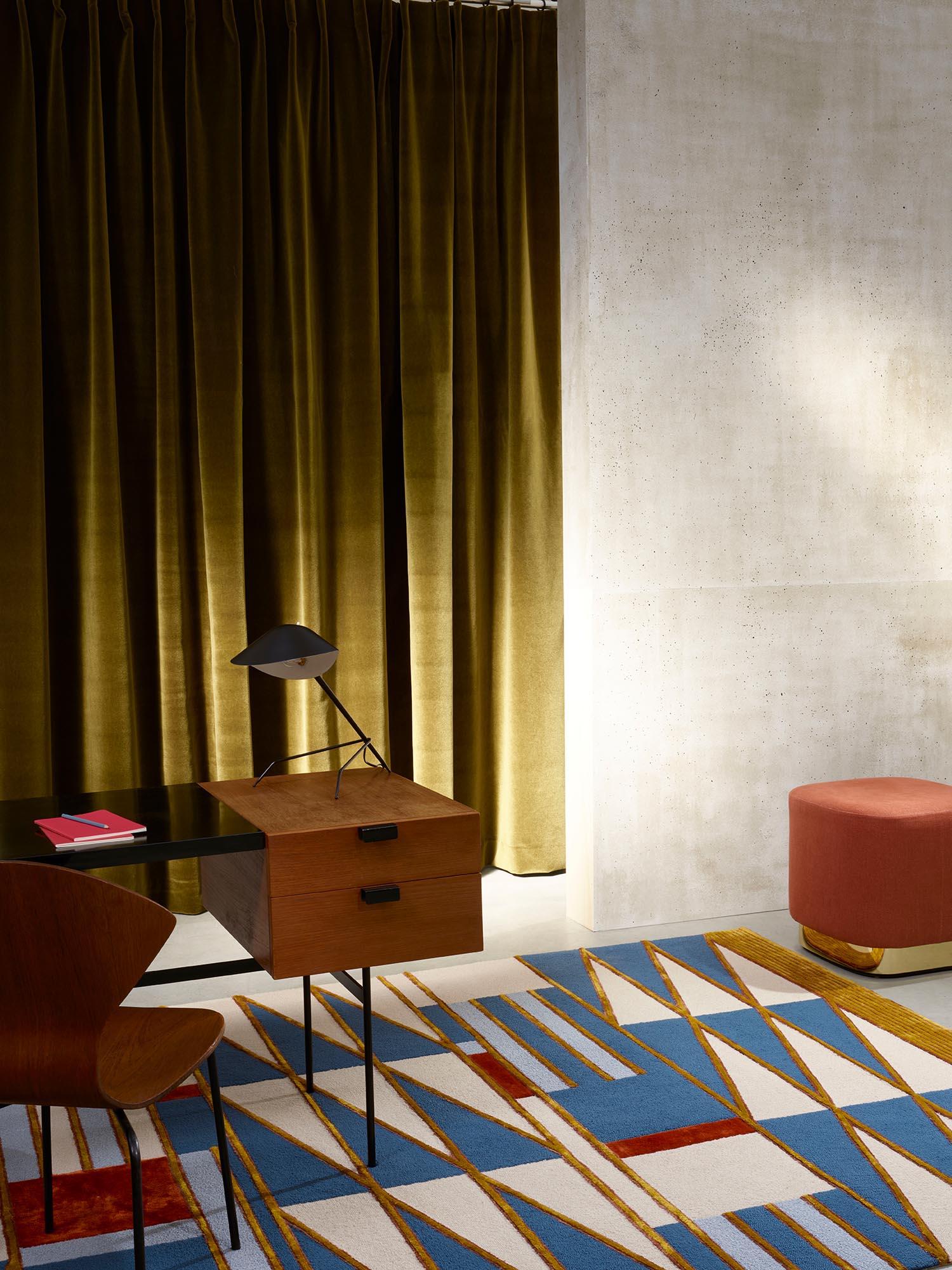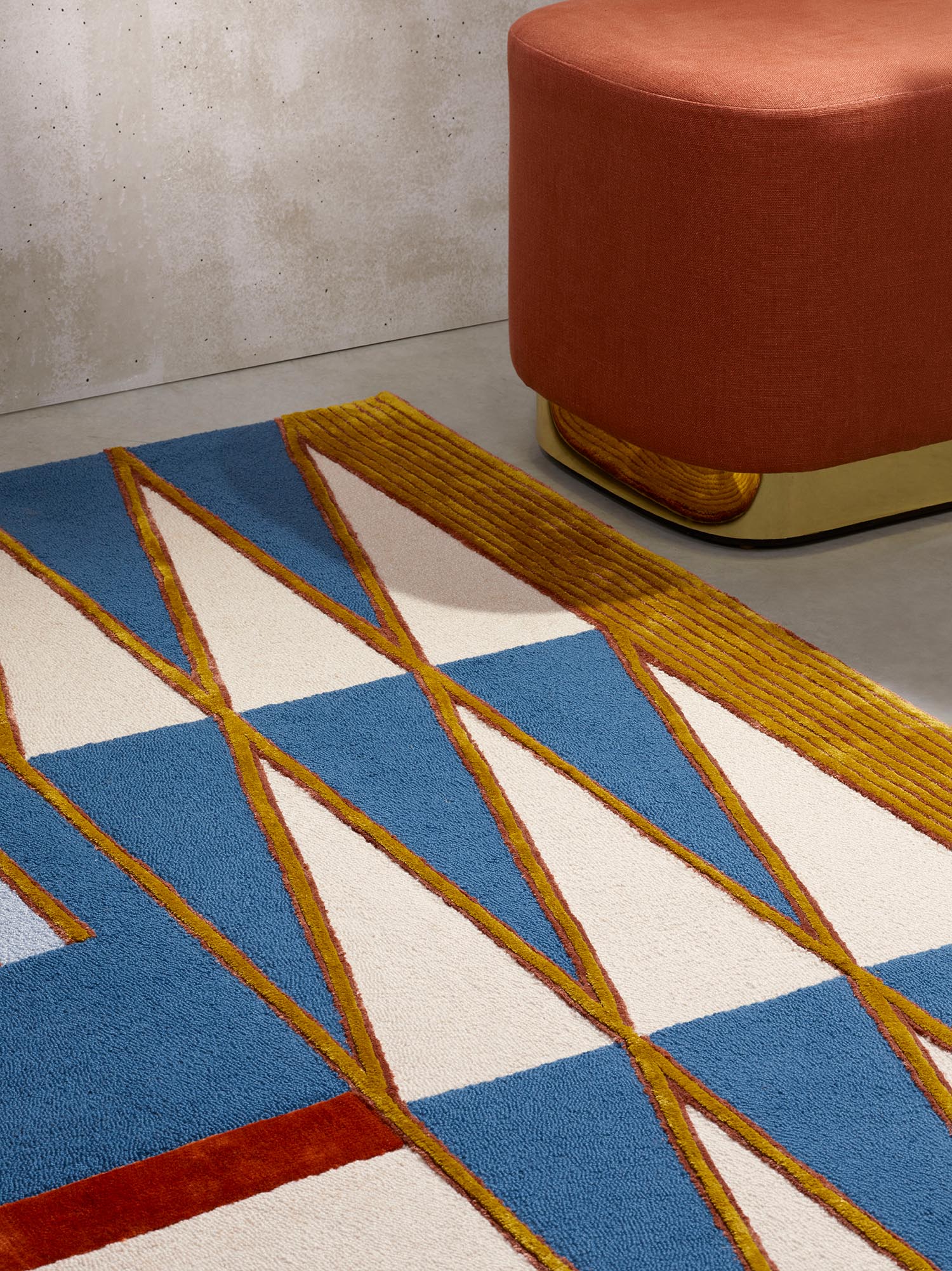 Inspired by an old African handicraft rug, this rug develops a set of graphic lines with several heights of botanical silk velvet, against a background of looped velvet made from New Zealand wool.