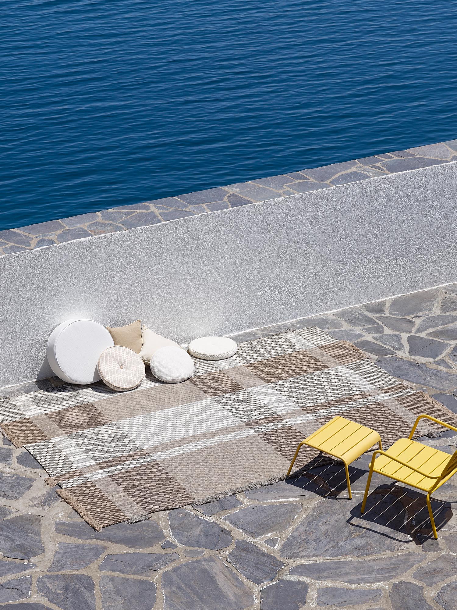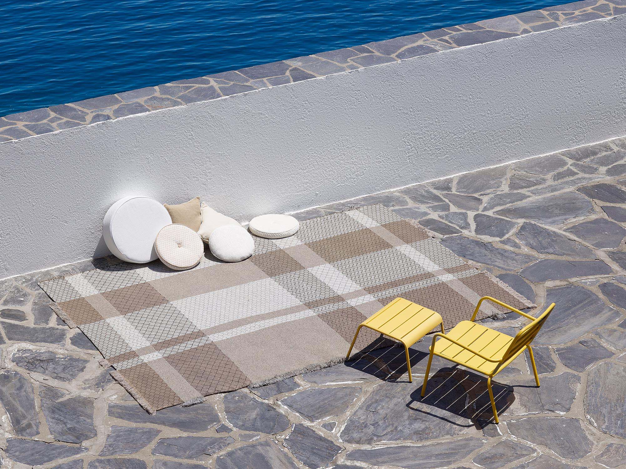 Maison Pierre Frey offers a collection of outdoor flat woven carpets. Perfectly adapted to the Indoor-Outdoor concept, the models in the collection are designed to be very easy to clean and have properties adapted to the «Outdoor». They can be used as desired for outdoor and indoor use. This collection offers two qualities of fibres, with certified performance and a 2-year guarantee. Both use the traditional technique of handmade flat woven fabrics, allowing each of these two fibres to look very different due to their unique characteristics.