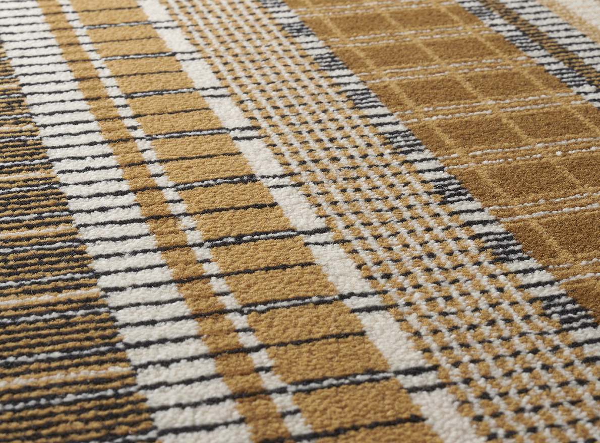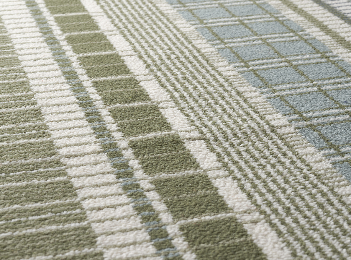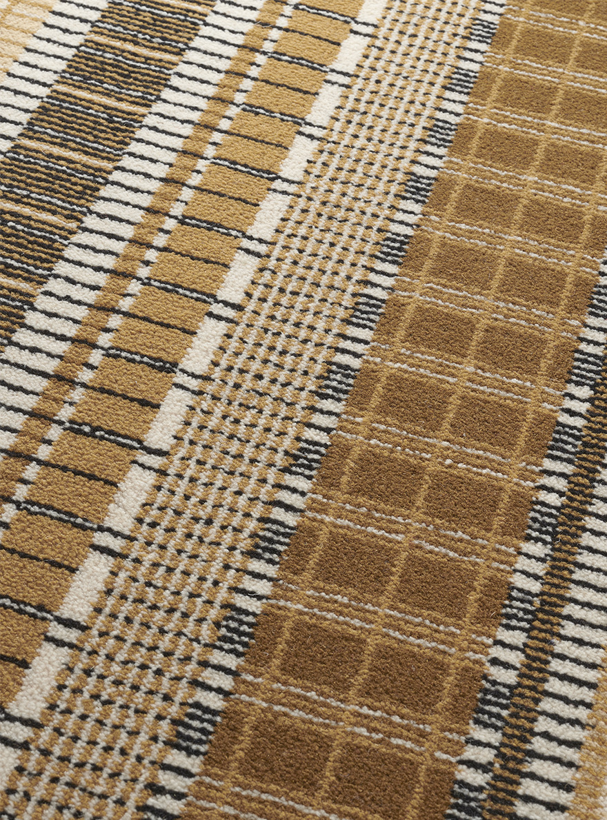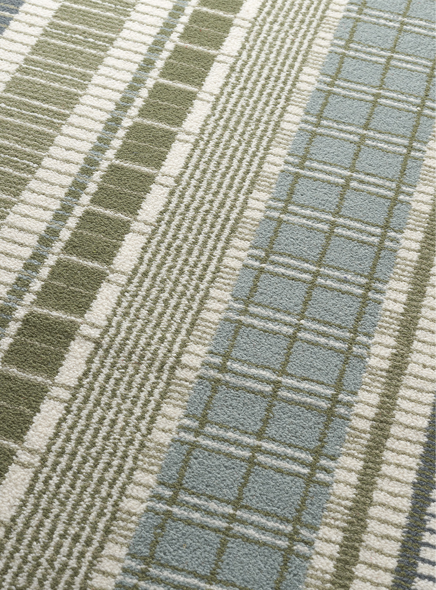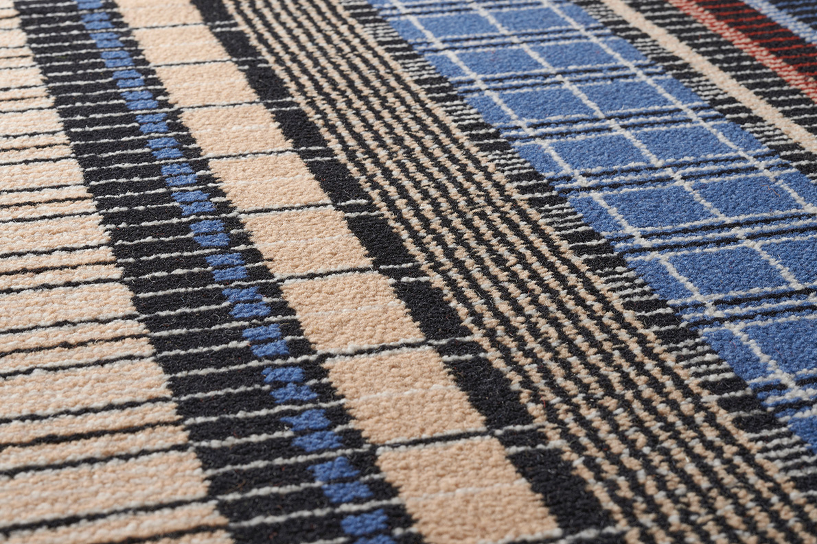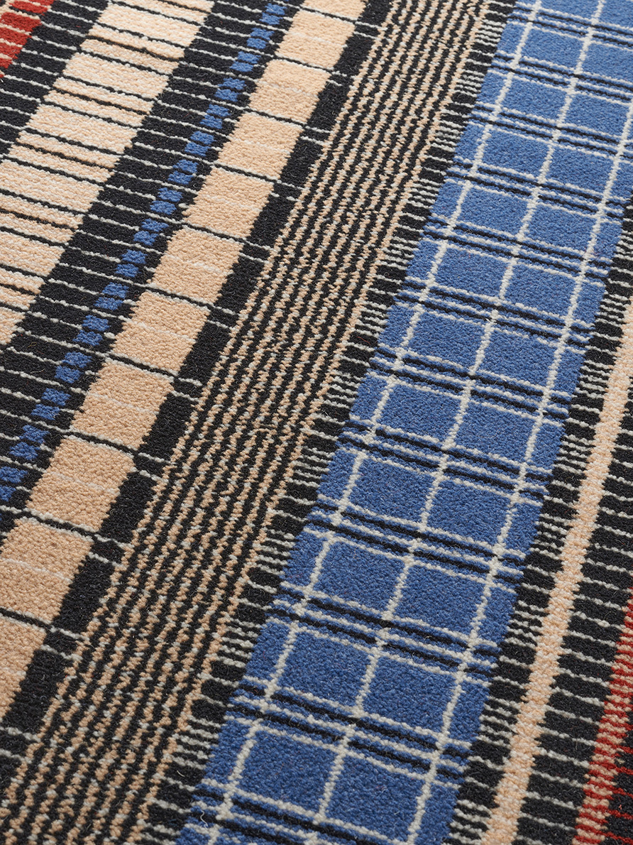 Oscillating between stripes and tartan, this carpet is an original mix of wefts and checks woven in 5 colours.