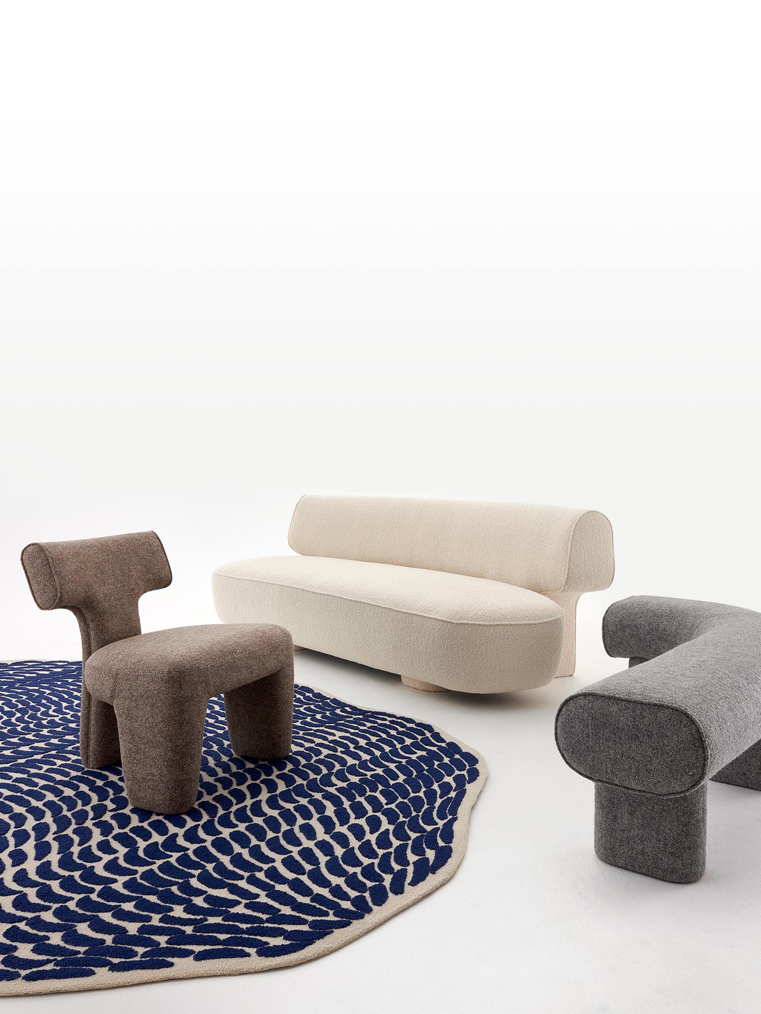 Guillaume Delvigne imagined for Pierre Frey three hand drawings transcripted into hand-tufted rugs. Original and unique in shape, they are a clever play of texture between a wool loop pile and a cut pile made with an other fiber.