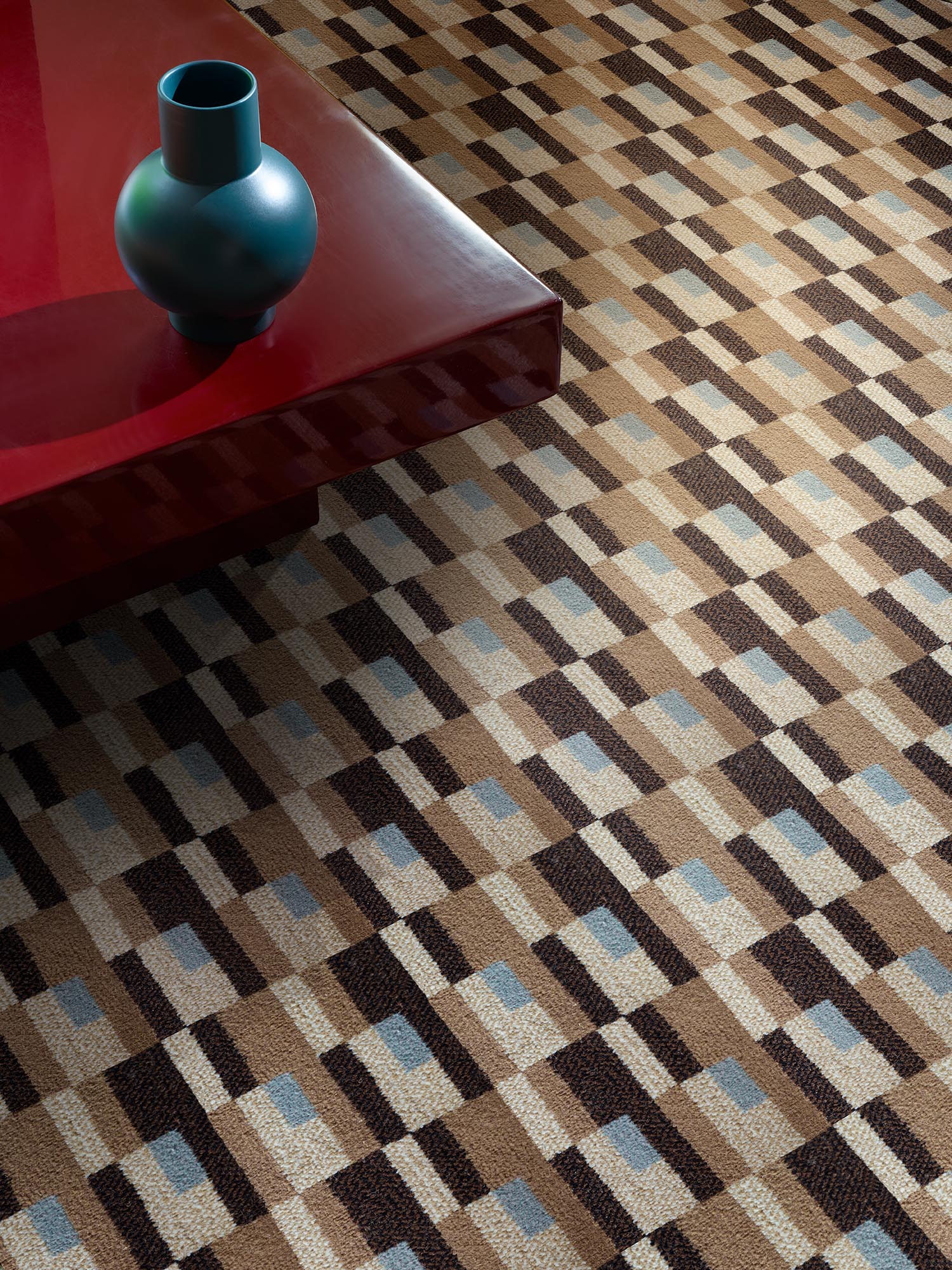 This timeless and modernist design was created by the textile designer Elise Djo-Bourgeois circa 1927. It features geometric interlocking patterns. Reinterpreted in an Axminster jacquard carpet, a weaving technique specific for high traffic, this graphic pattern is available in two colors.