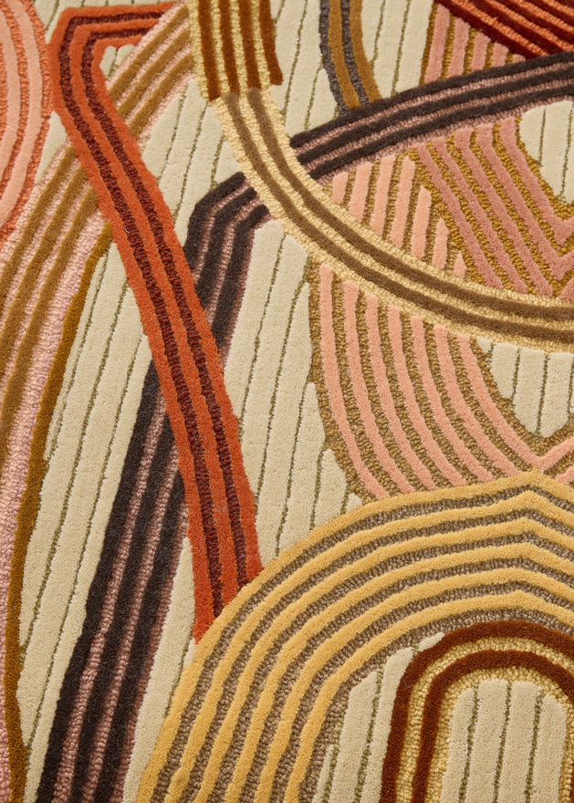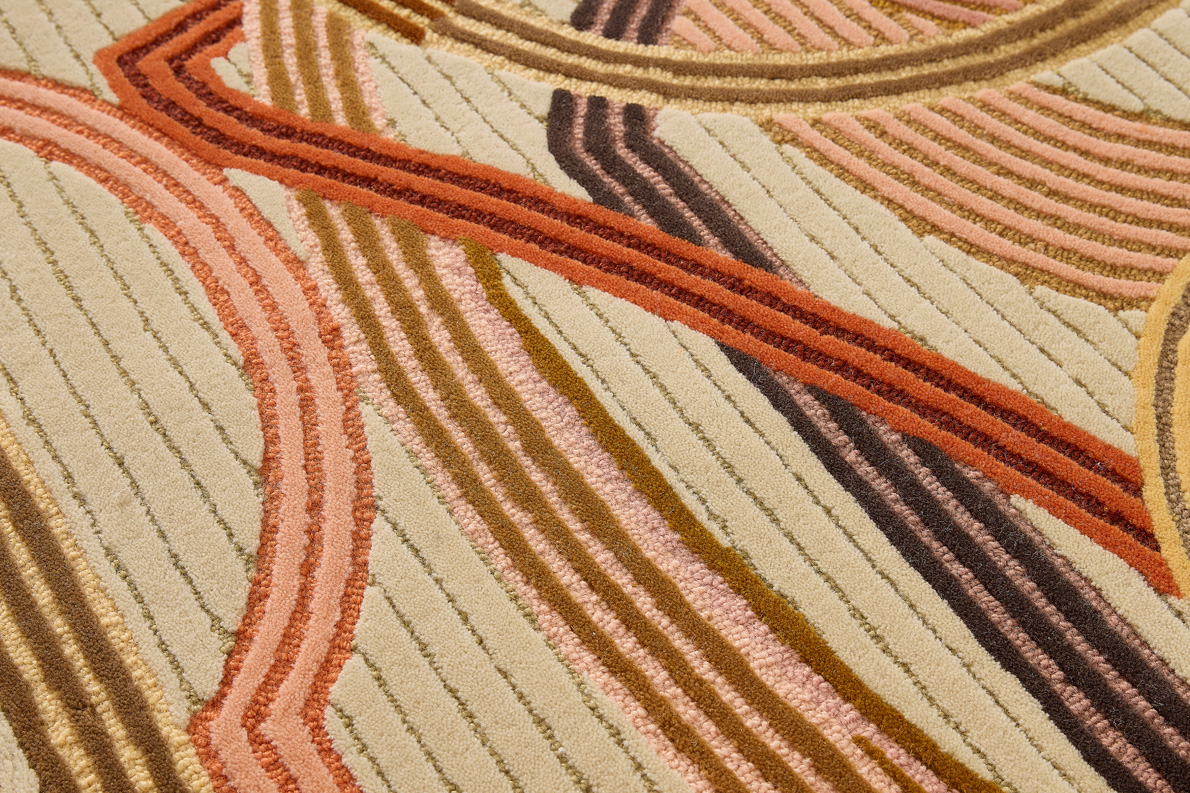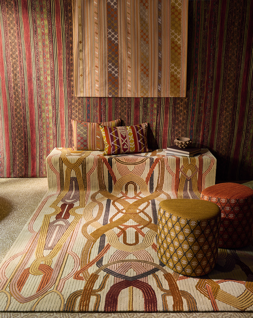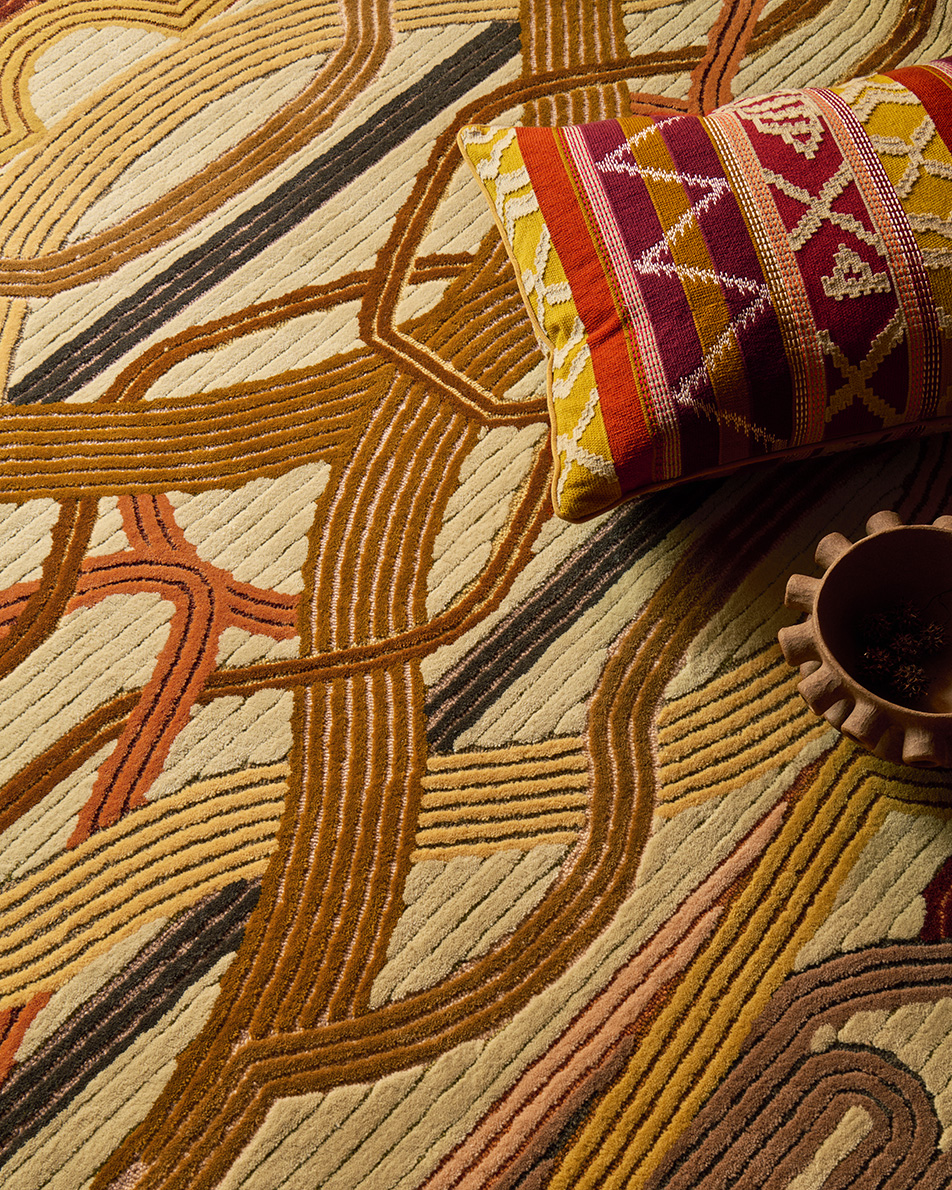 With its intersecting and intertwining lines, CAMELUS evokes straps, harnesses and fabric strips that connect and disconnect, in reference to the nomadism of caravans. Ochre, leather and bronze hues are enhanced by the alternation of cut and loop pile, which brings depth and richness to the rug.