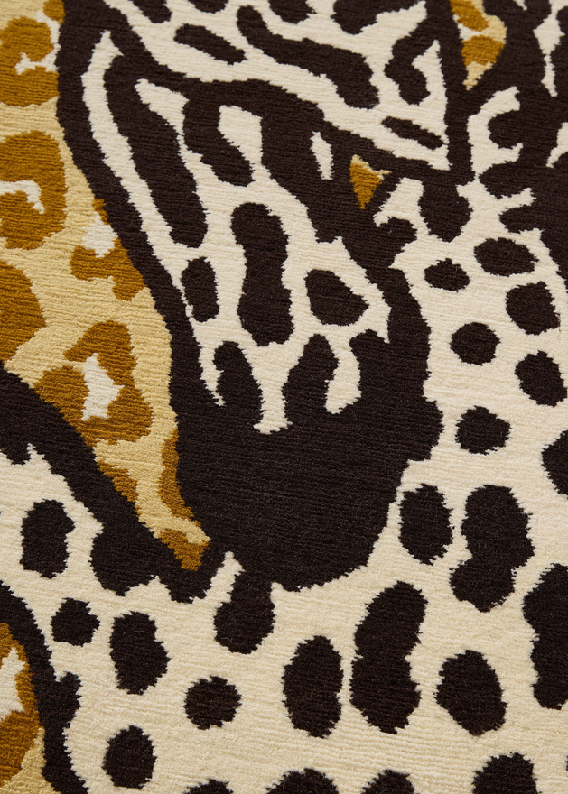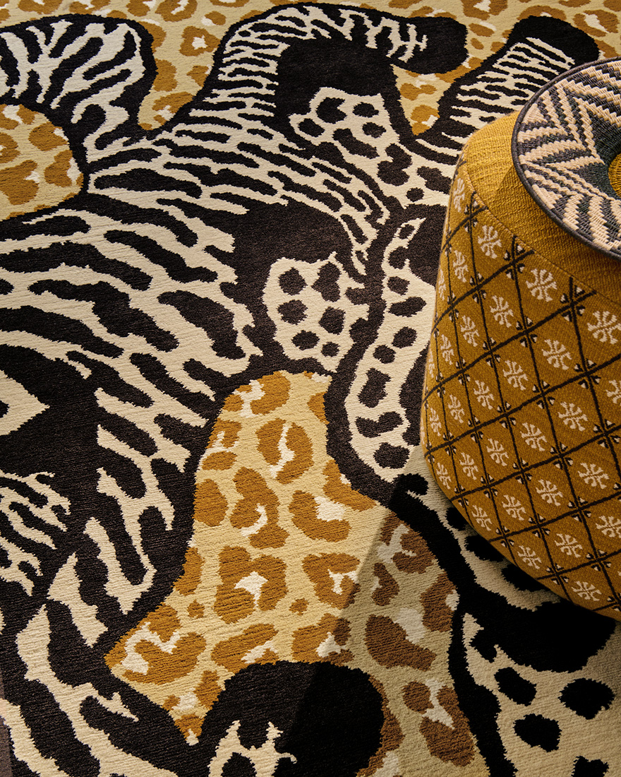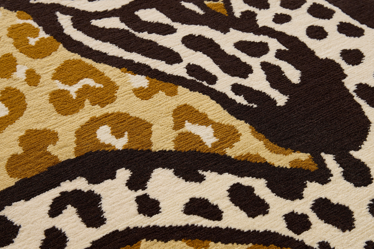 A creation inspired by a patchwork of animal skins, LUBIN is a magnificent Nepalese hand-knotted rug. On a leopard wool pile background, two wild beasts dance and play in the heart of the desert.