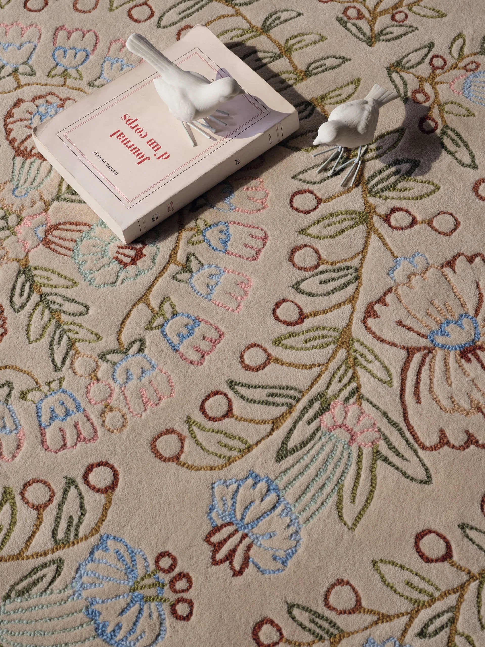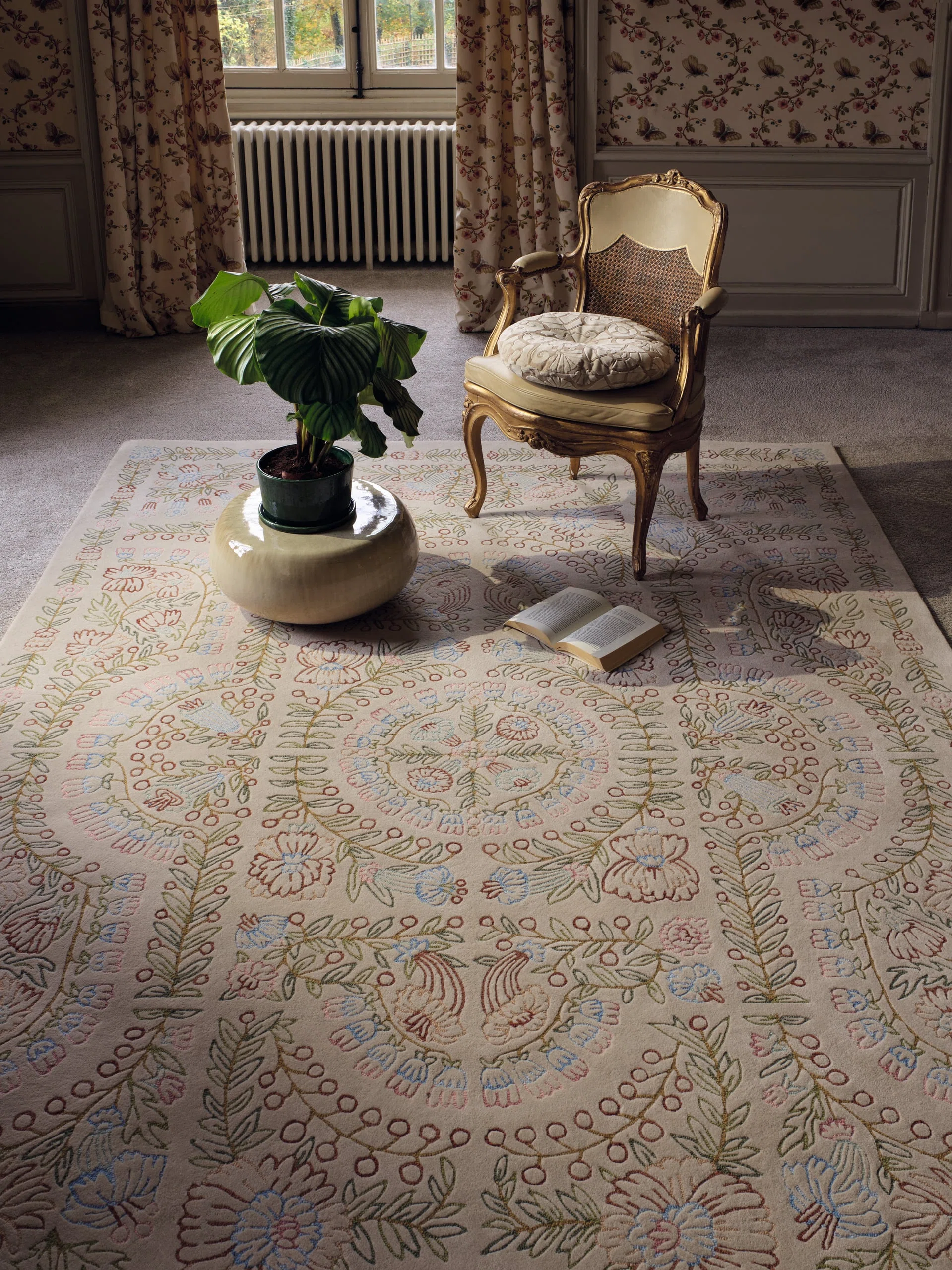 As if resting on velvet, a parterre of delicately drawn, multicolored flowers are hand tufted in New Zealand wool. The delicate and finely executed loop stitch gives this fresh and light design an embroidered look, evoking French gardens.