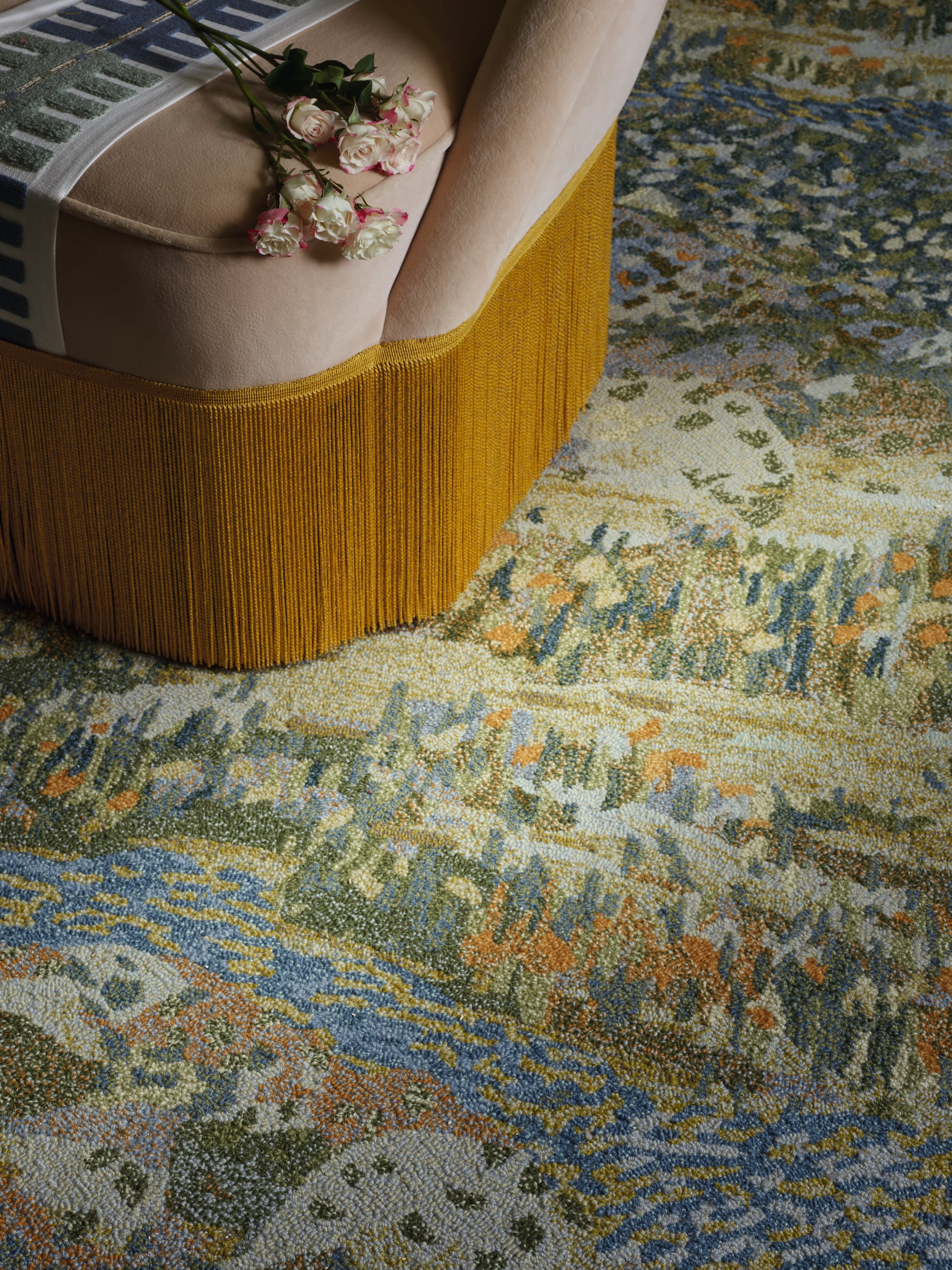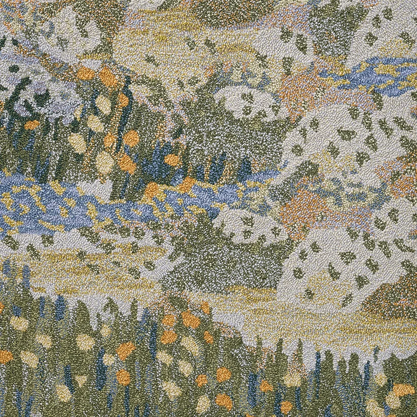 CAMPAGNE reinterprets one of the brand's classic prints, designed by Bénedicte de Frondeville in the 1980s in a pointillist style, reminiscent of a bucolic landscape with a river running through it. Entirely made of hand-tufted wool loop, a clever mix of mottled colors brings both softness and character to this original and unique rug.