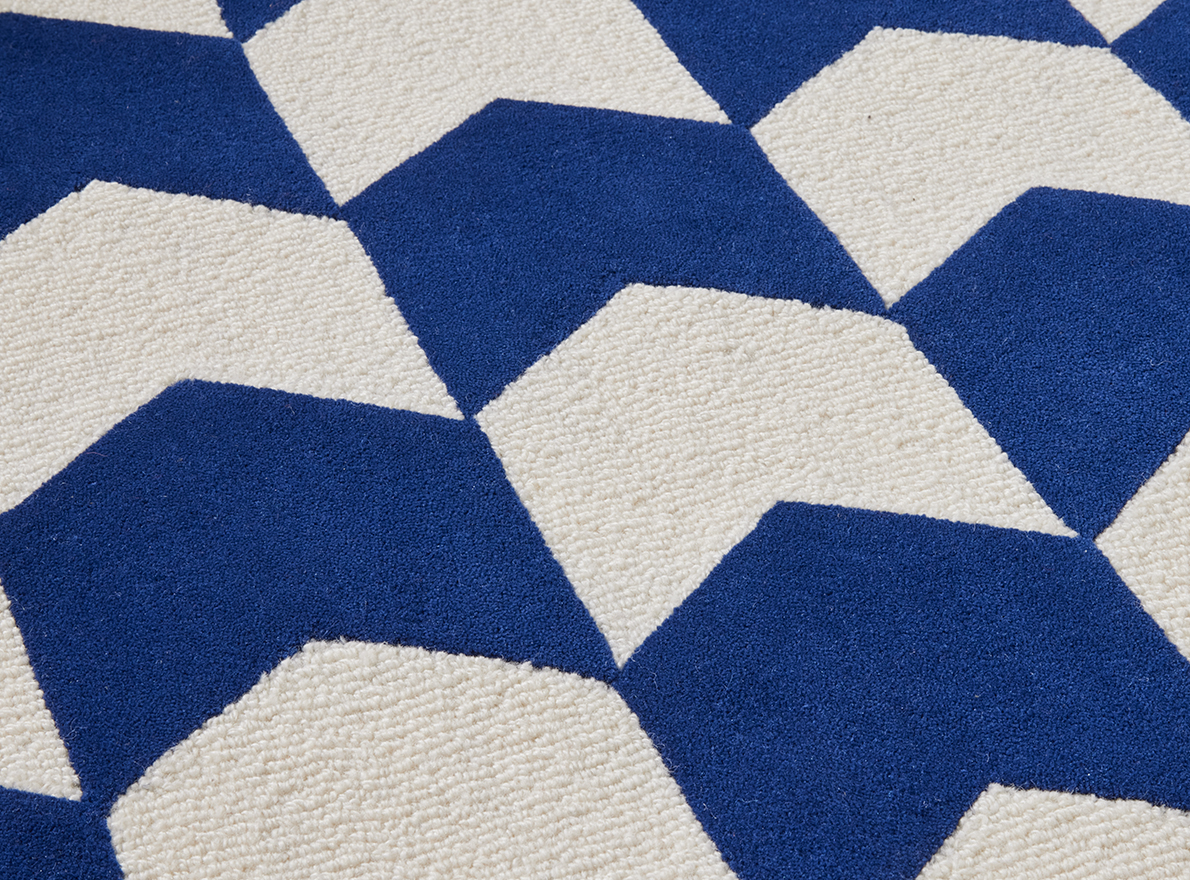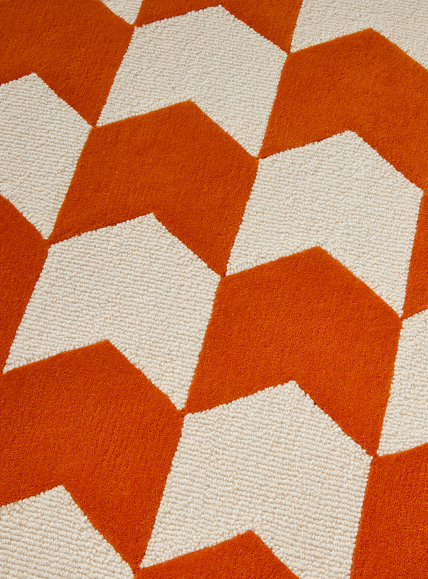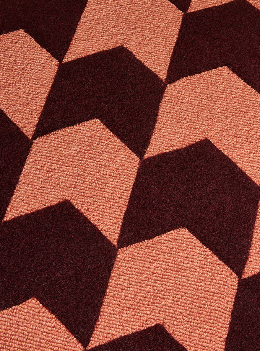Contemporary and graphic interpretation of a neo-medieval motif evoking the banners of knights. Hand-tufted, alternating New Zealand wool cut and loop pile.