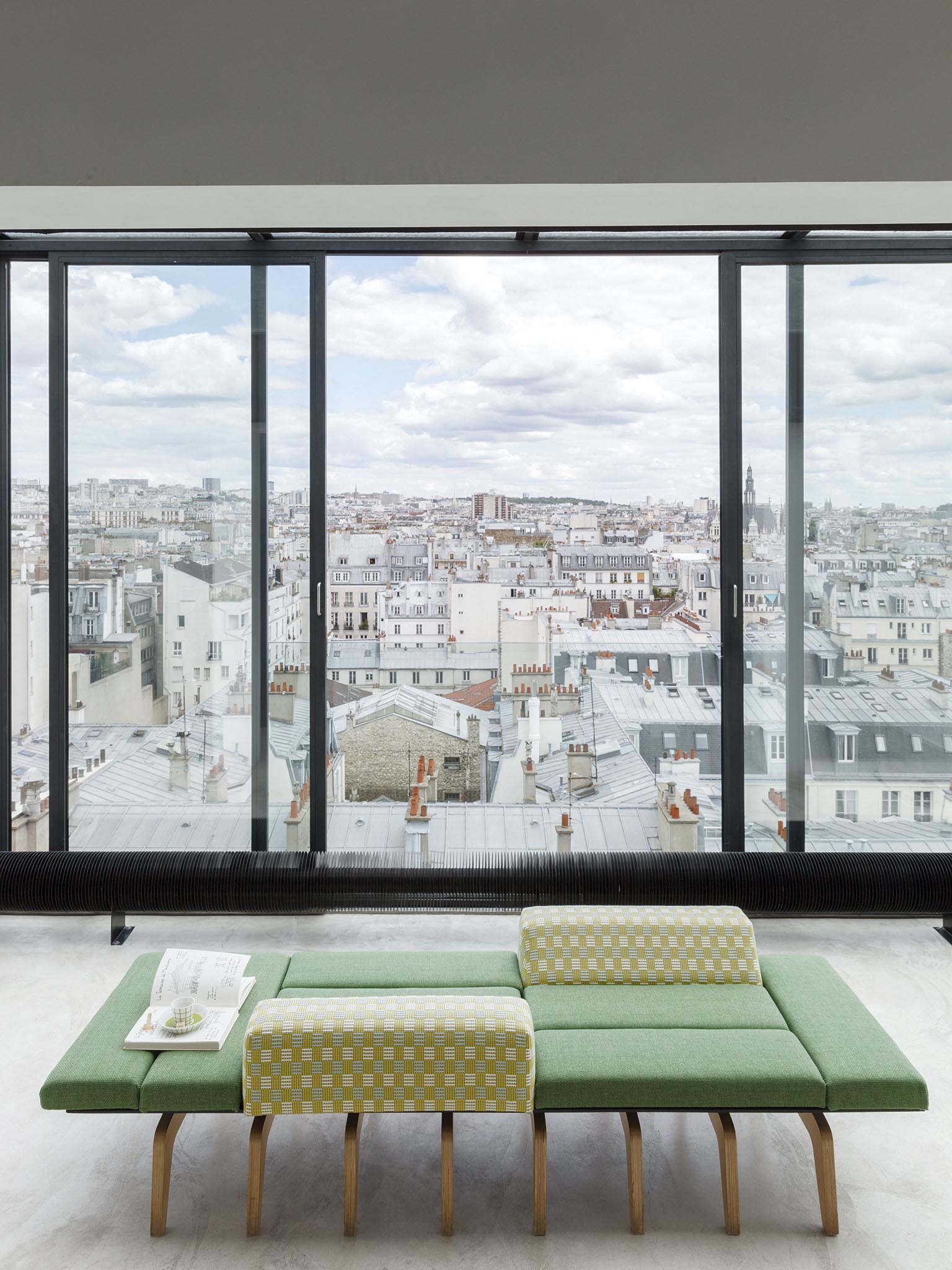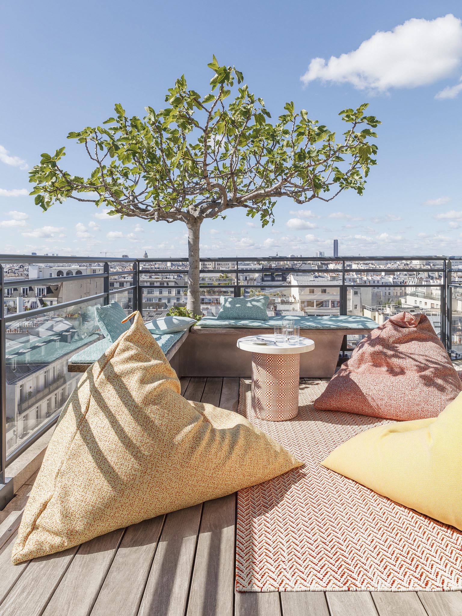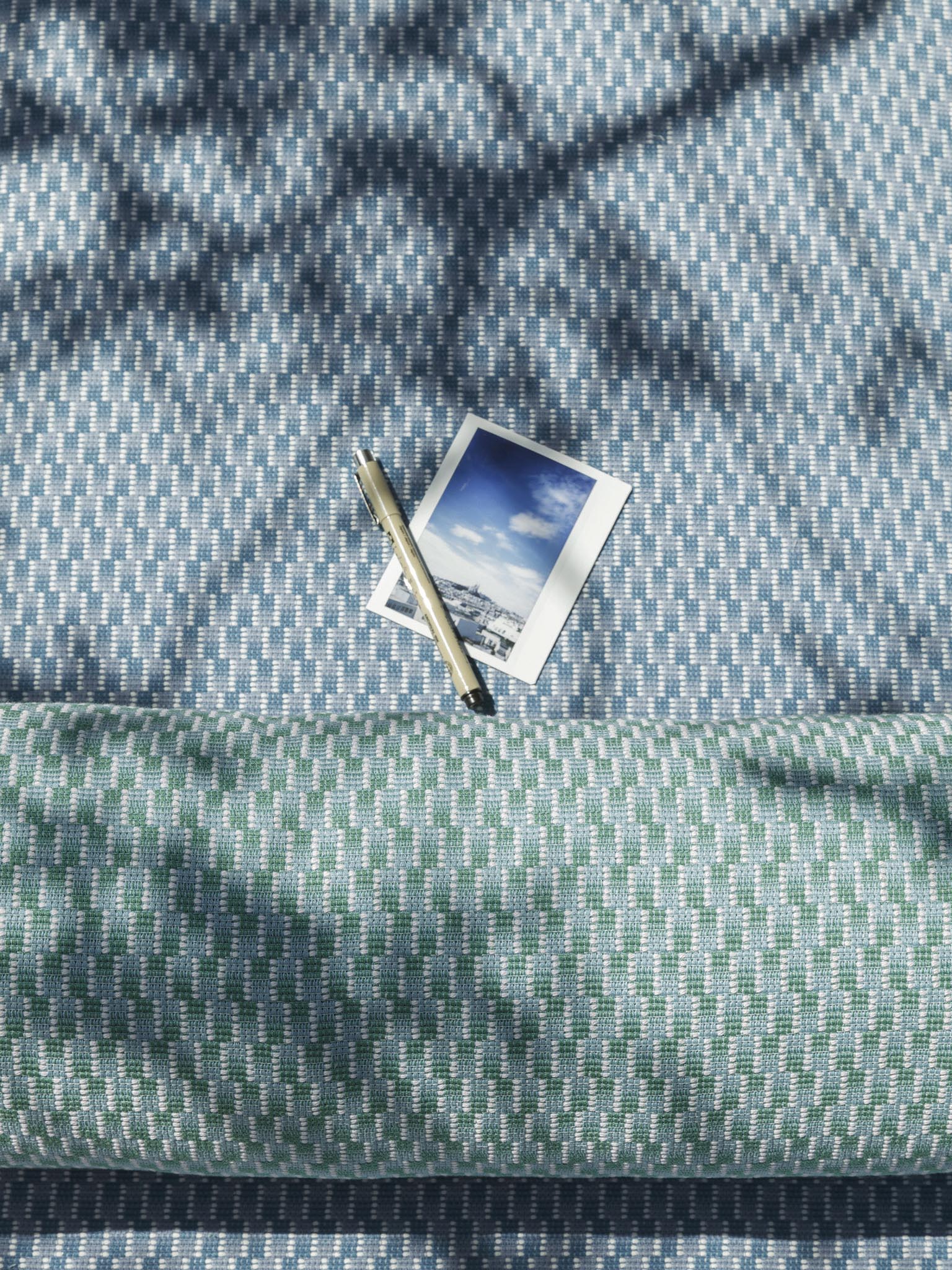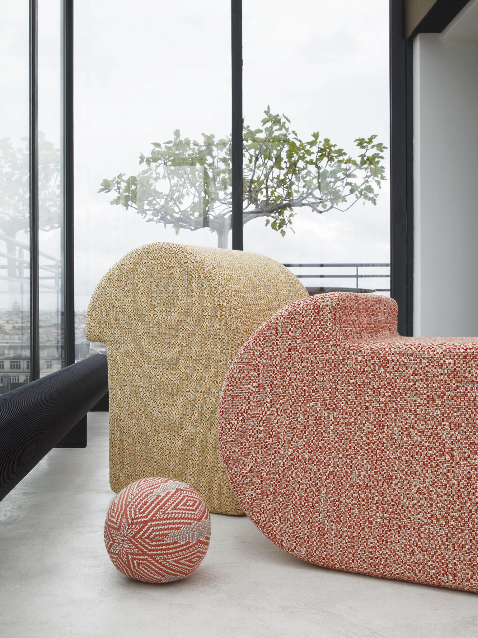 Inspired by the graphic tiles of a gouache carpet from the Pierre Frey archives, the different patterns in fresh and luminous colors recall the canework of bistro chairs and evoke the sunny terraces of the south and the Basque coast.