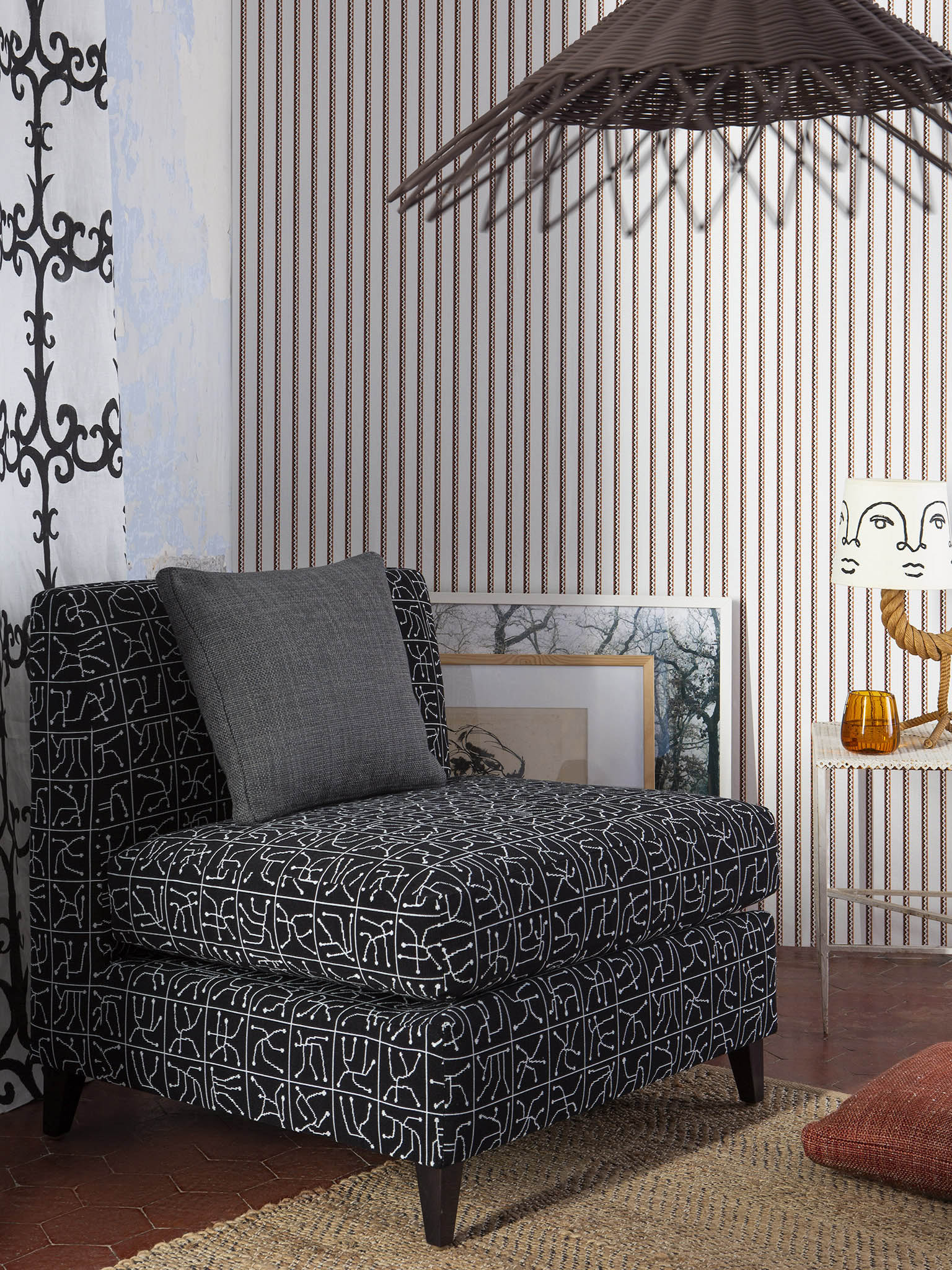 Natural materials, such as linen, cotton, silk or raffia, expressed here with strength and purity, are a nod to the traditional Provencal know-how. A subtle blend of precious qualities, graphic effects and woven using outdoor threads, this collection is imagined in spaces open to the outdoors.