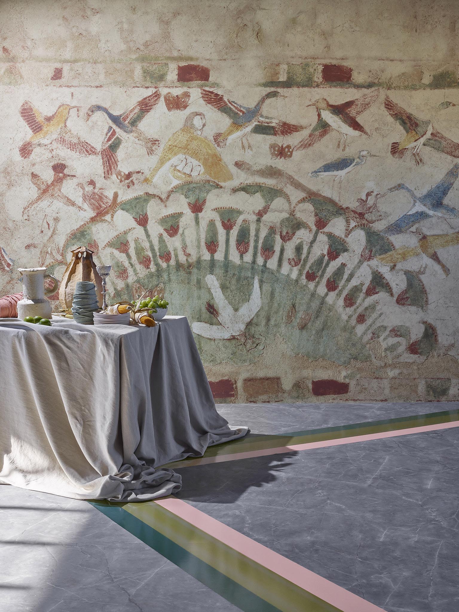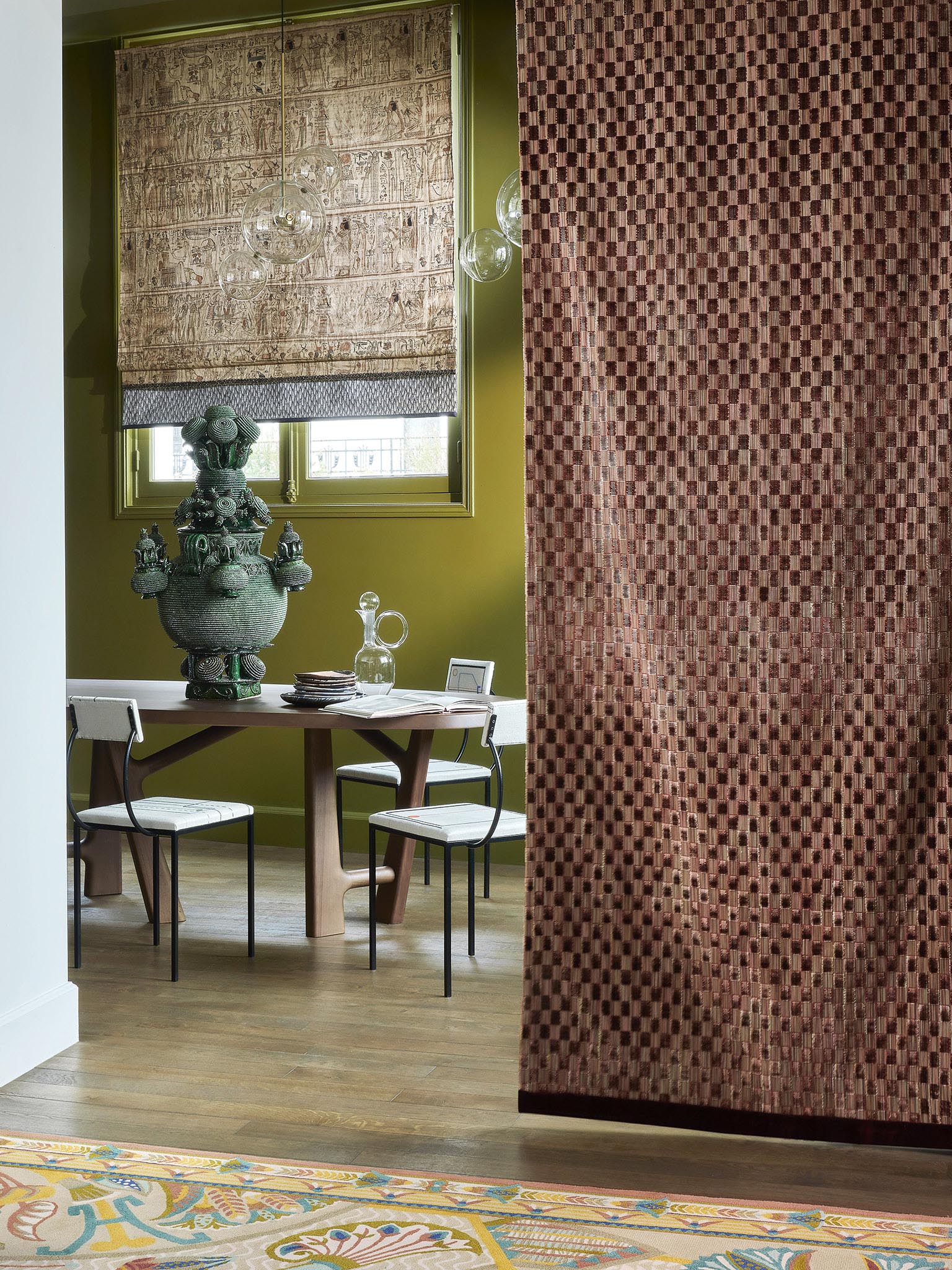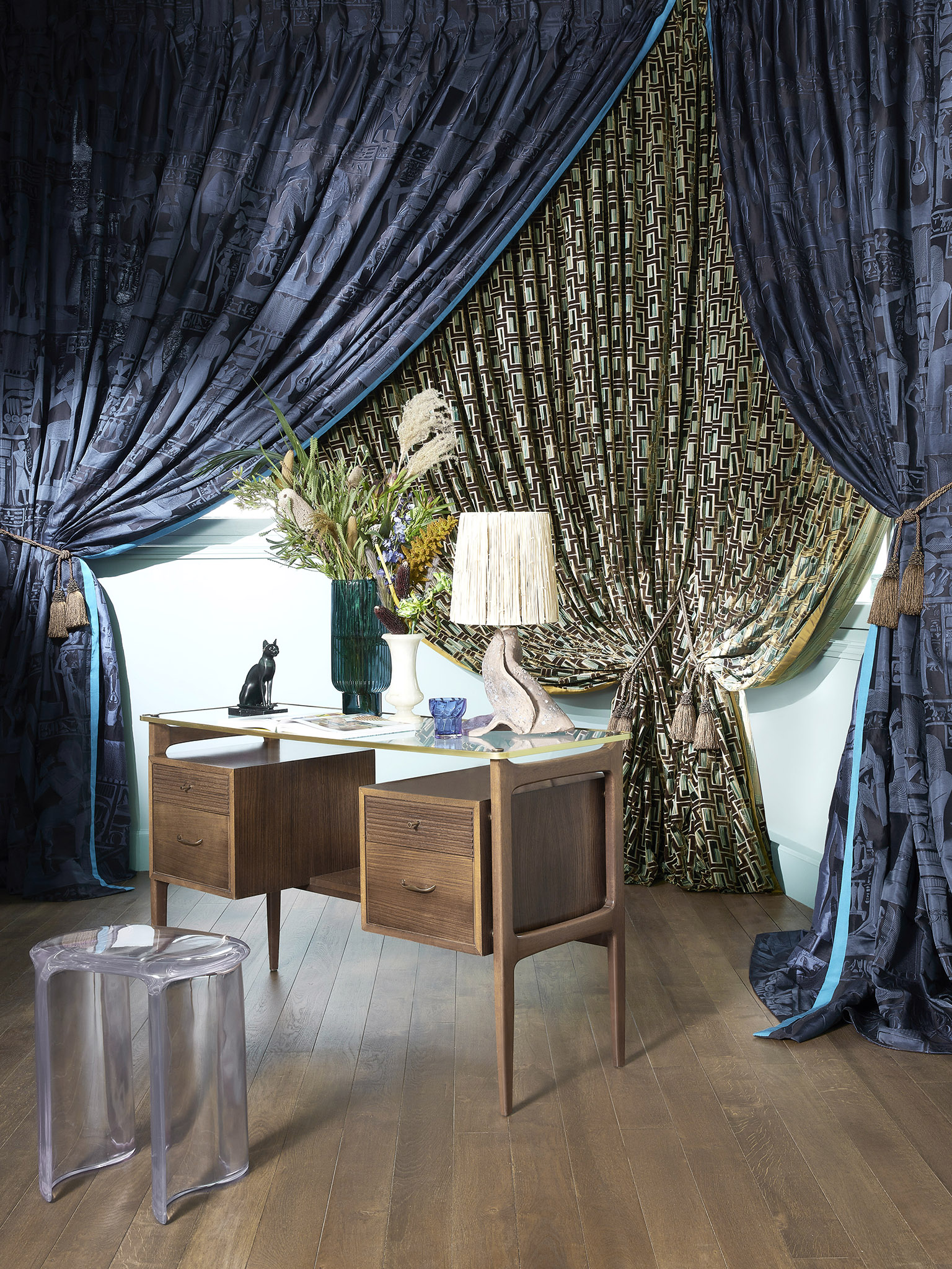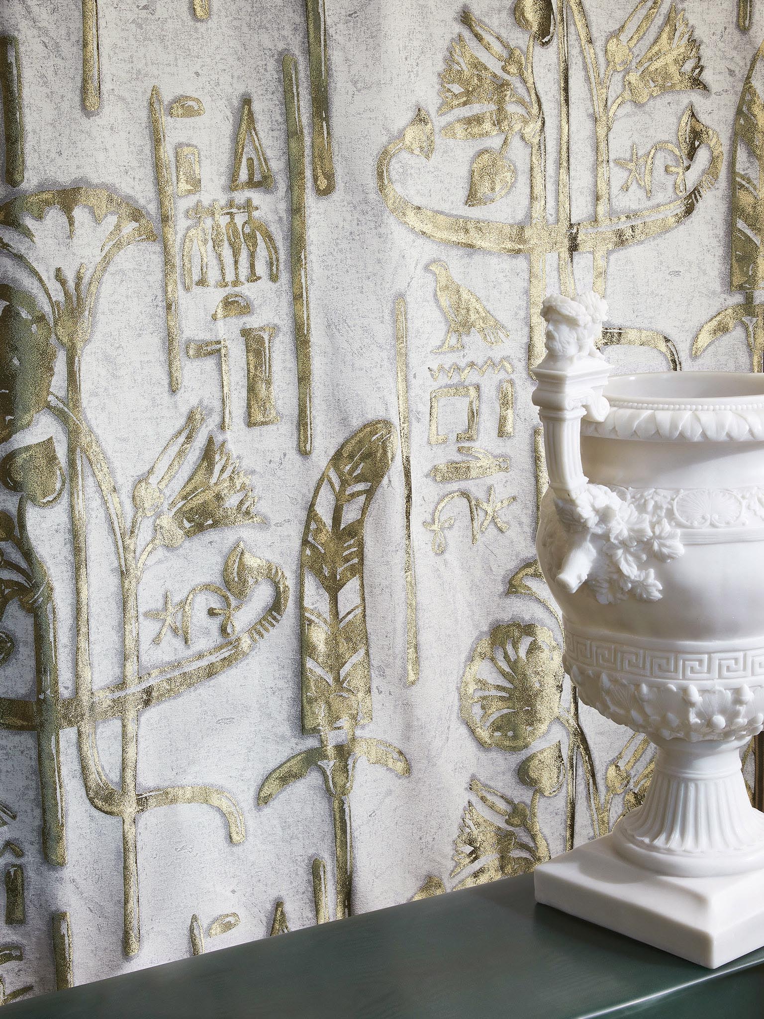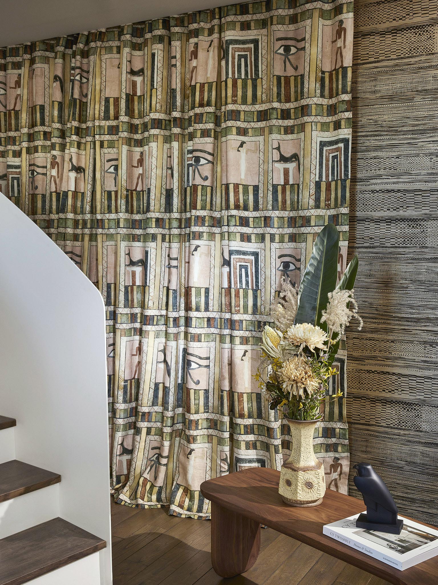 Working in partnership with the Louvre to celebrate, in particular, the bicentenary of the discovery of hieroglyphs by Champollion in 1822, the Maison Pierre Frey new collection displays a wide range of motifs and drawings, between faithful reproductions and free inspirations, with a respectful view of the preserved works but also a contemporary and graphic reading.