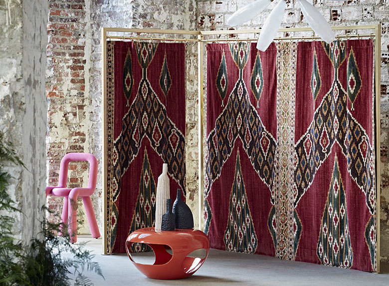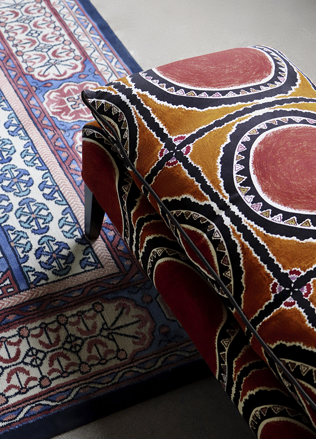 Reinterpreted, the old drawings from the archives of the Maison Pierre Frey blend harmoniously with the representations of celebratory clothing and other embroidery treasures, as if in a precious bazaar.