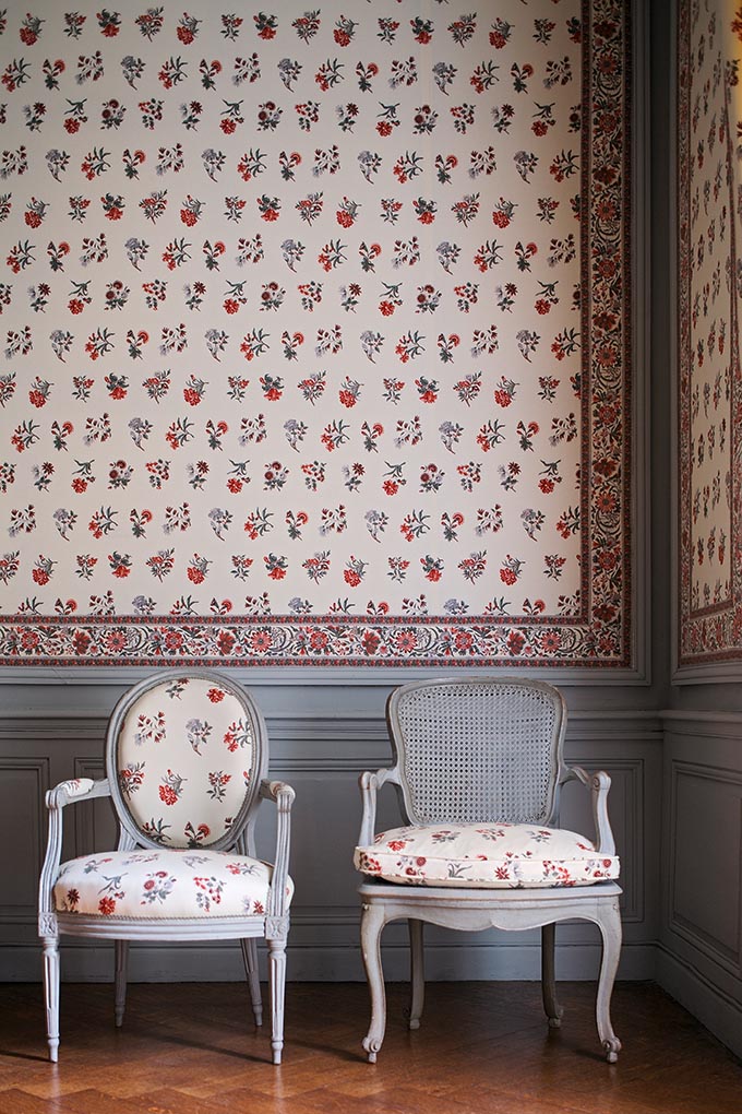 Delicate print reproducing the charm of a floral shawl printed at the Manufacture Royale Oberkampf in Jouy-en-Josas around 1785.
