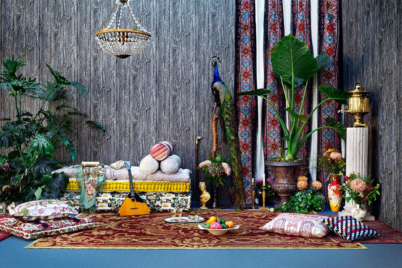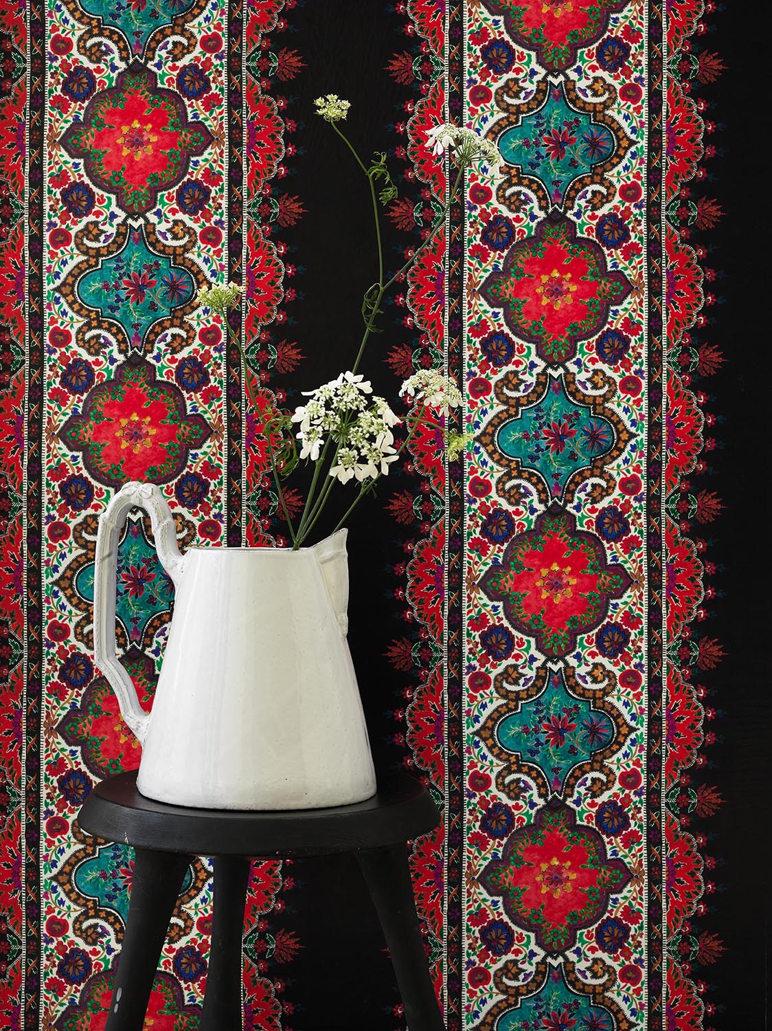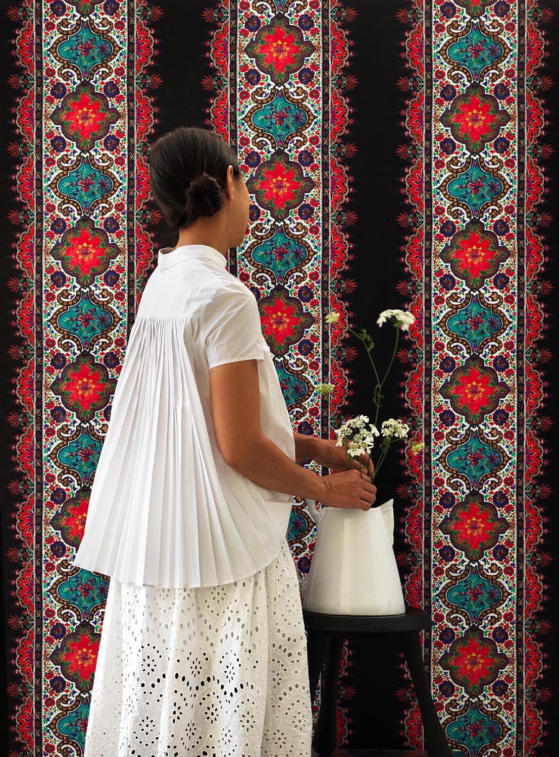 The cashmere shawl was the height of fashion during the Second Empire. We interpreted it with broad stripes making use of three different techniques: velvet appliqué, embroidery and print.