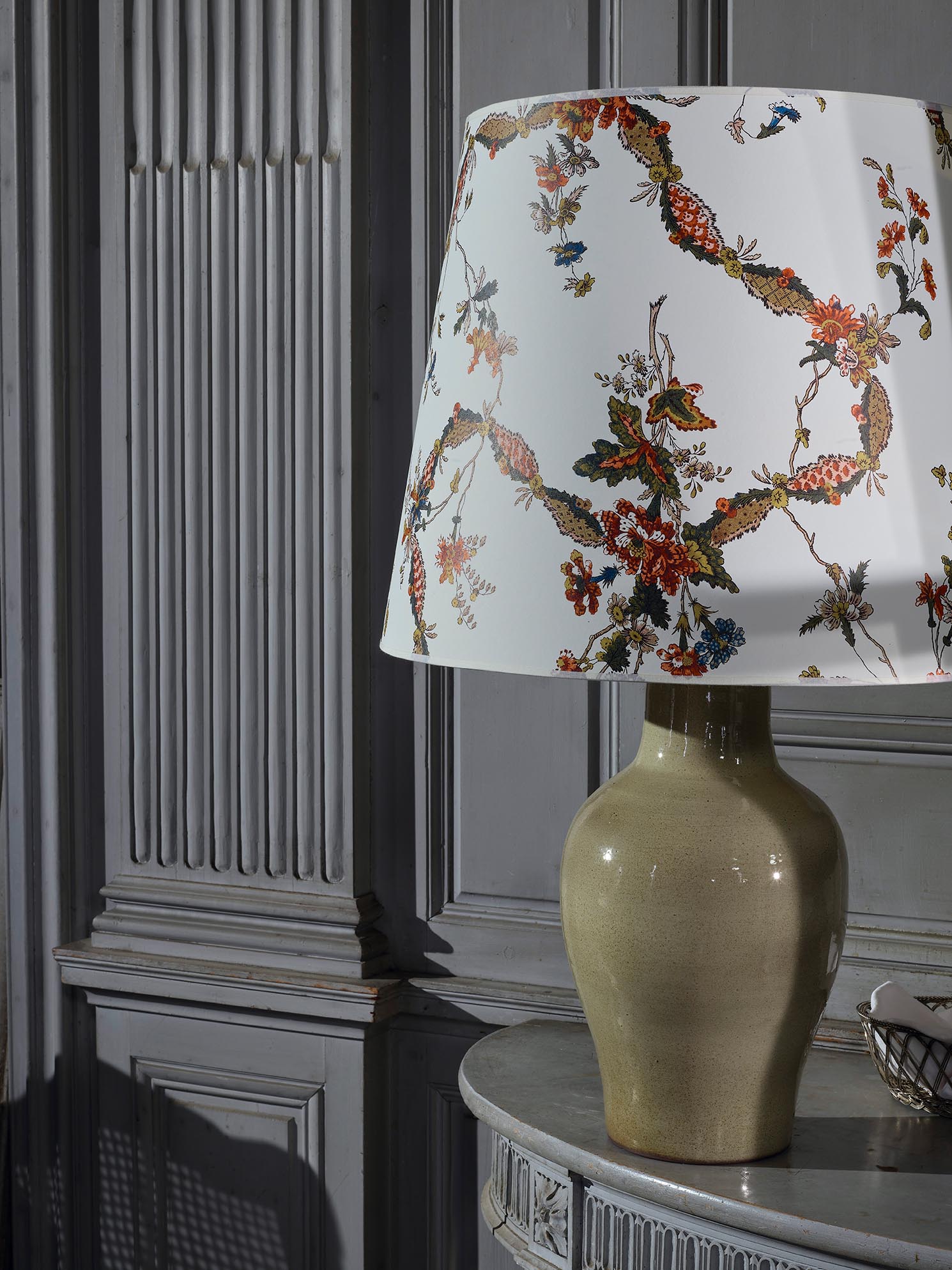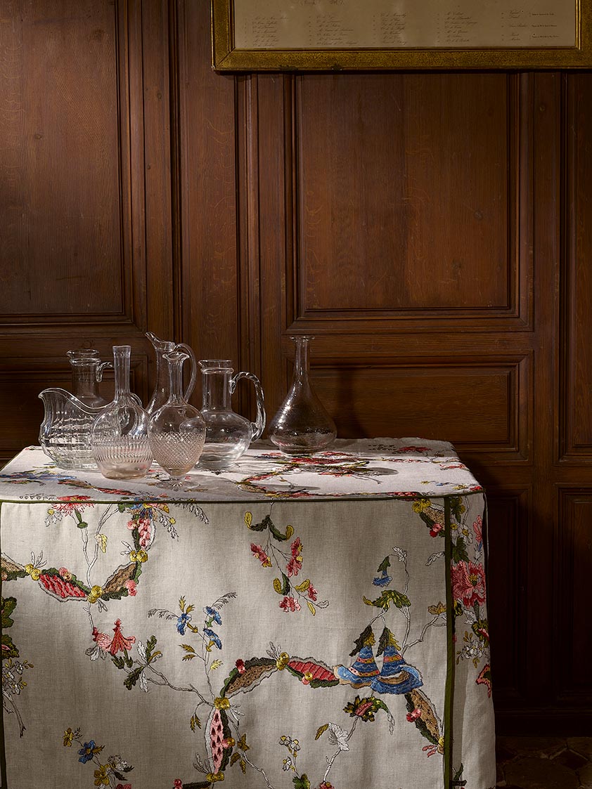 This embroidery on linen, with ribbons delicately intertwined with flowers, is a reinterpretation of a canvas printed with the block printing technique around 1789 by the Woolmer Collins factory in England. The original document is preserved in the Maison archives.