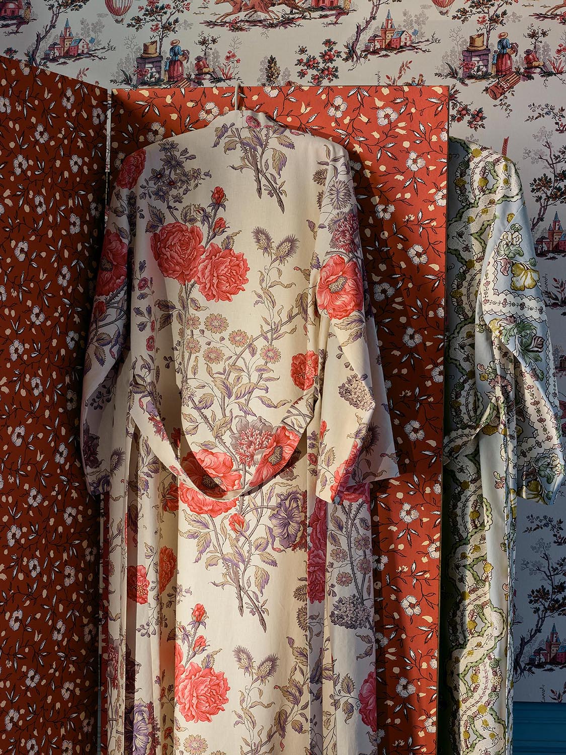 A reinterpretation of a document printed with the block printing technique characteristic of Louis XVI and preserved in the archives of the Maison, CLISSON's drawing sees ribbons and flowers intermingle on different colored backgrounds.