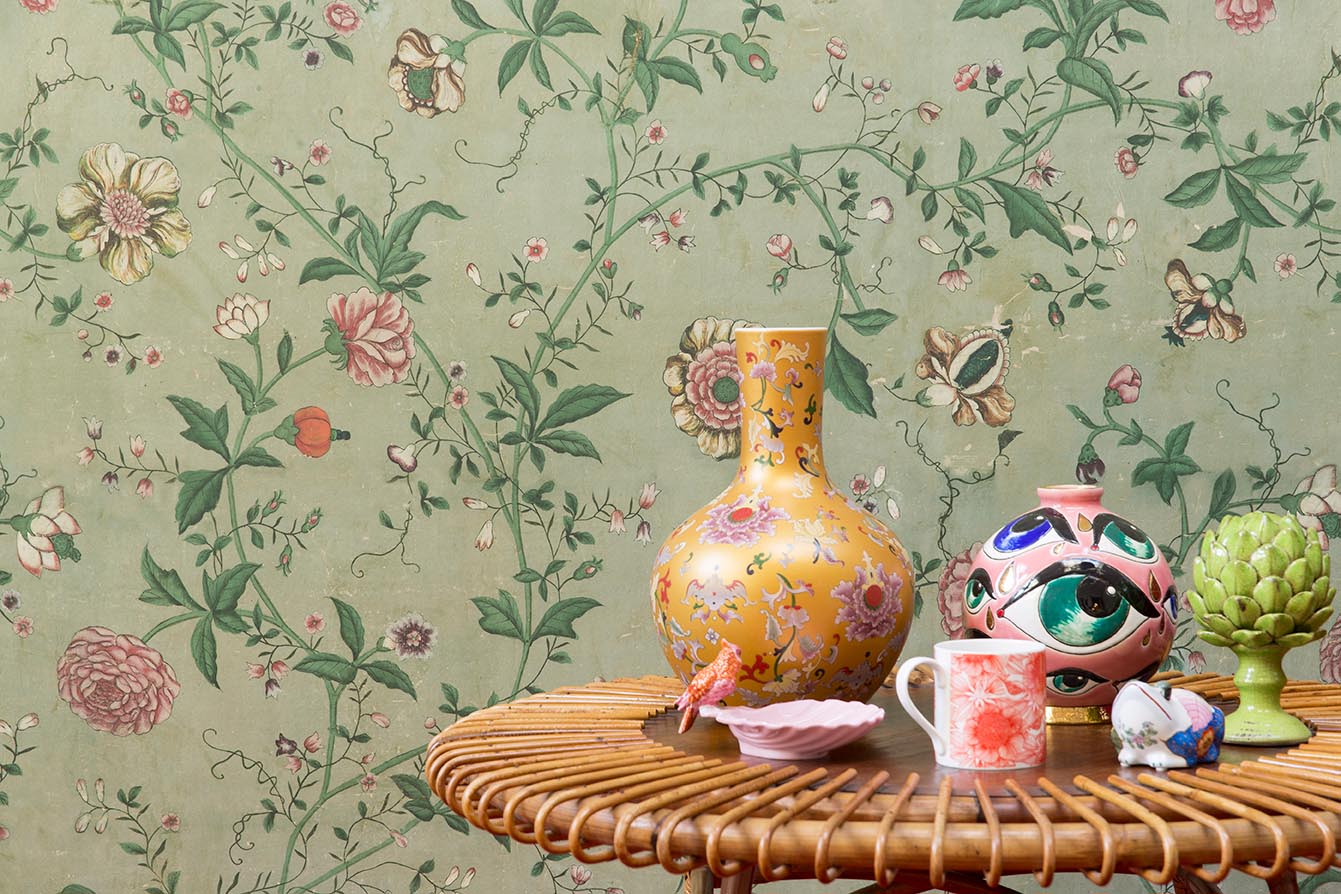 Reproduction of a screen covered with a canvas painted in China belonging to the famous American designer John Derian, this floral composition dating from the eighteenth century is printed on a cotton percale. The cracks and the patina of time are preserved to replicate the archive. Also available as a print on glazed percale and as wallpaper.