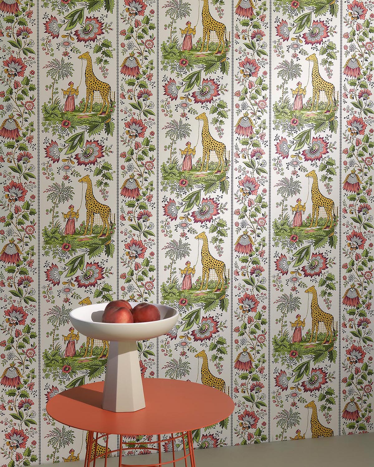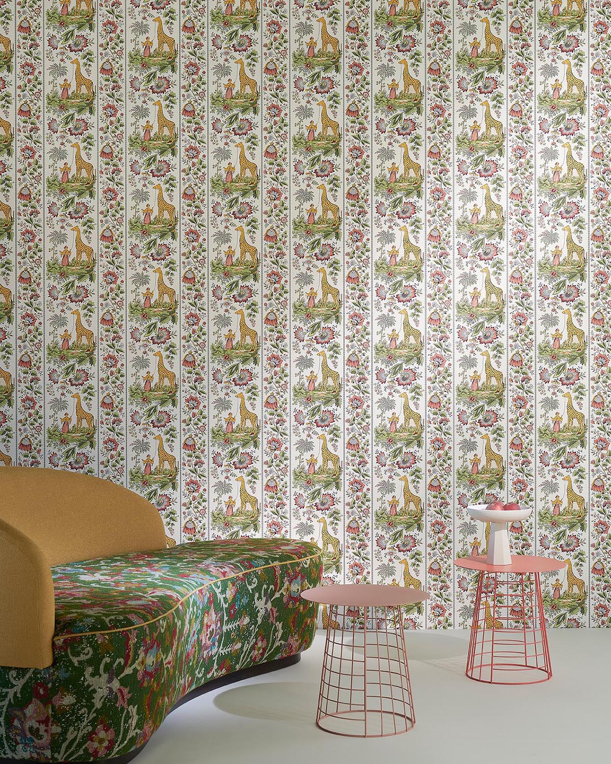 ISMAELIA reproduces a canvas printed around 1830, entitled "La girafe", kept at the Musée de l'impression sur Etoffes in Mulhouse. The animal intended for Charles X, unloaded in Marseille in 1826, crossed France to reach the menagerie of plants in Paris. This extraordinary event gave birth to the "giraffomania" in the decorative arts.