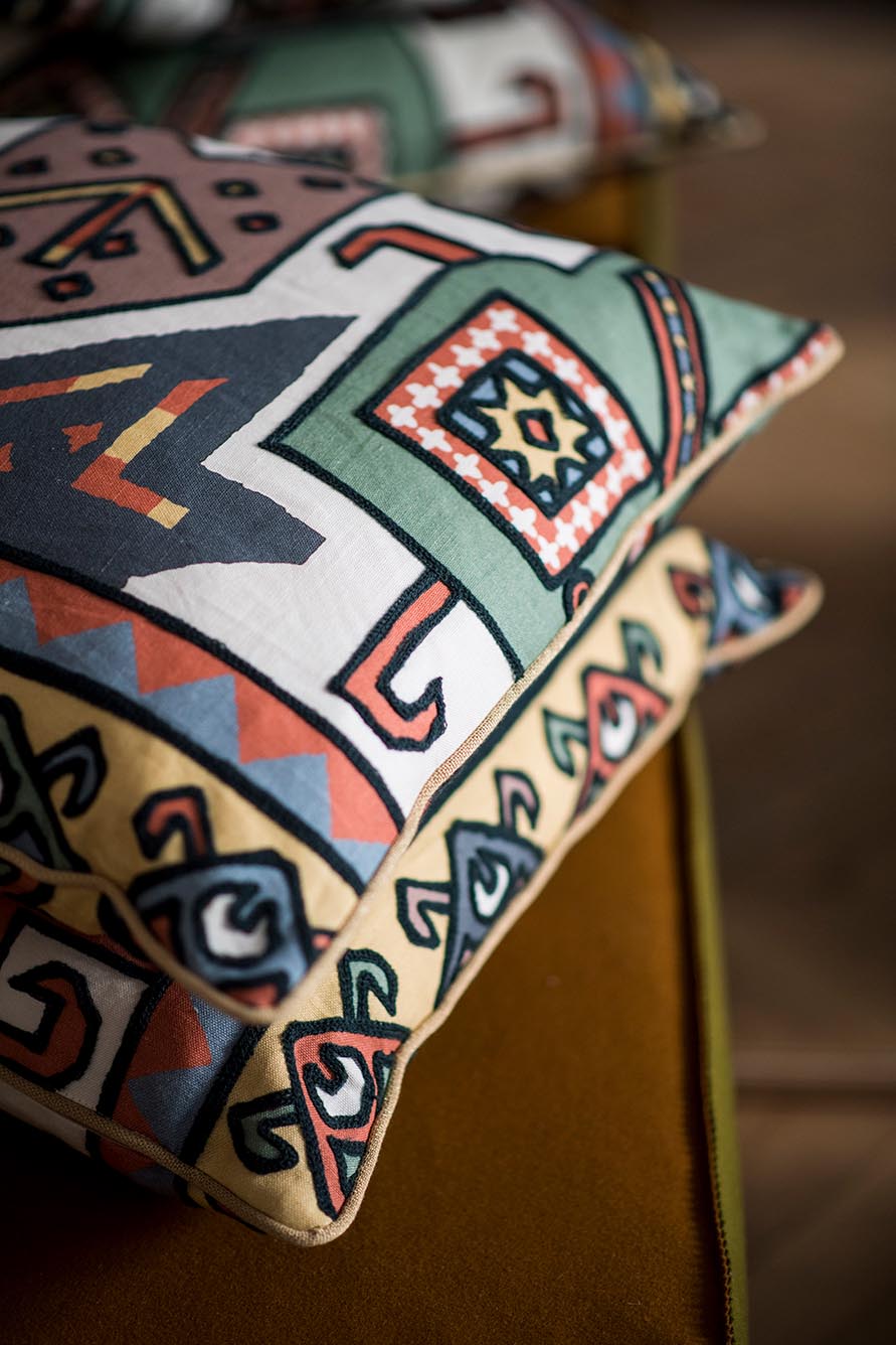 Combining print and embroidery on linen, this large pattern is representative of the Native American iconographic repertory based on geometric motifs. The ocher tones echo the aridity of the Far West.