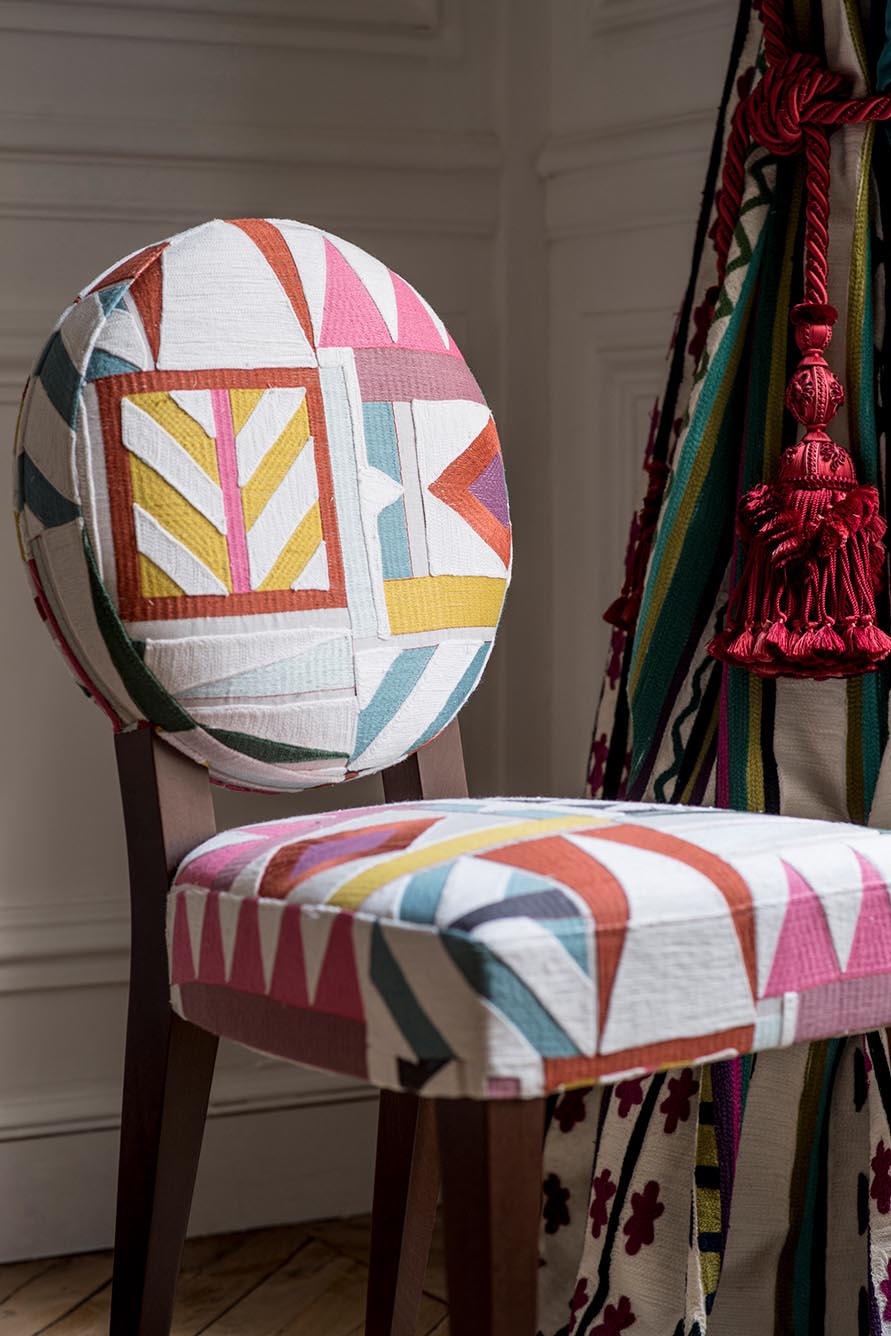This embroidery on linen evokes traditional rugs with nested geometric patterns that produce a very contemporary decorative effect.