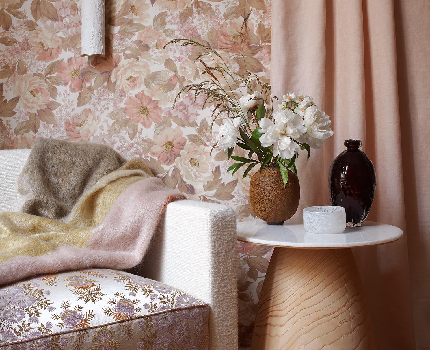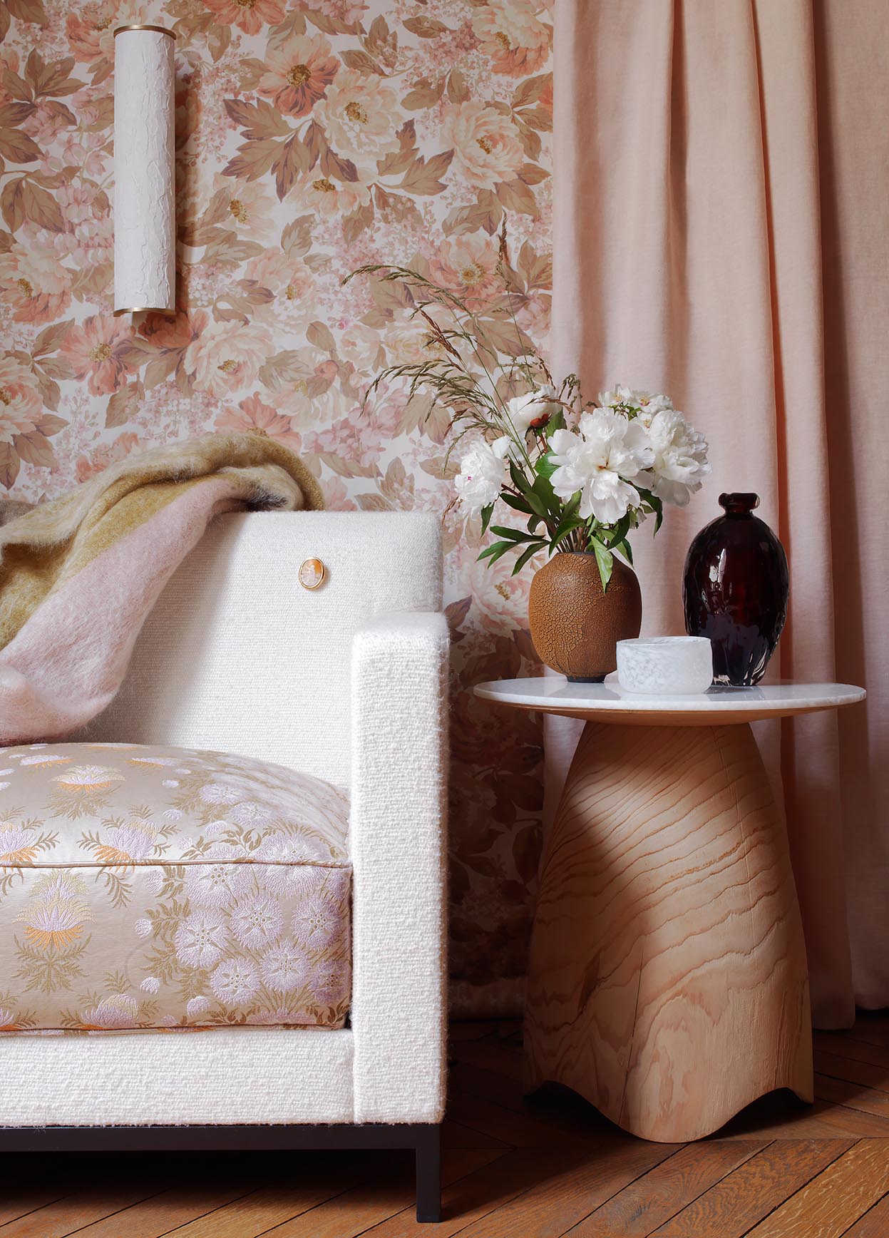 Gilles & Boissier's 'Les trois sœurs' capsule collection for Pierre Frey.Victoire is a silky jacquard that reproduces a very beautiful brocaded lampas from the mid-18th century. Its originality lies in its finely chiné satin finish. The motif is composed of a floral garland alternating with a semé of stylised flowers that evokes Chinese lampas, fabrics renowned under Louis XVI and during the reign of Louis-Philippe.Gilles & Boissier revisits this sumptuous fabric for Maison Pierre Frey in memory of his dreams in front of the Queen's room in Versailles.