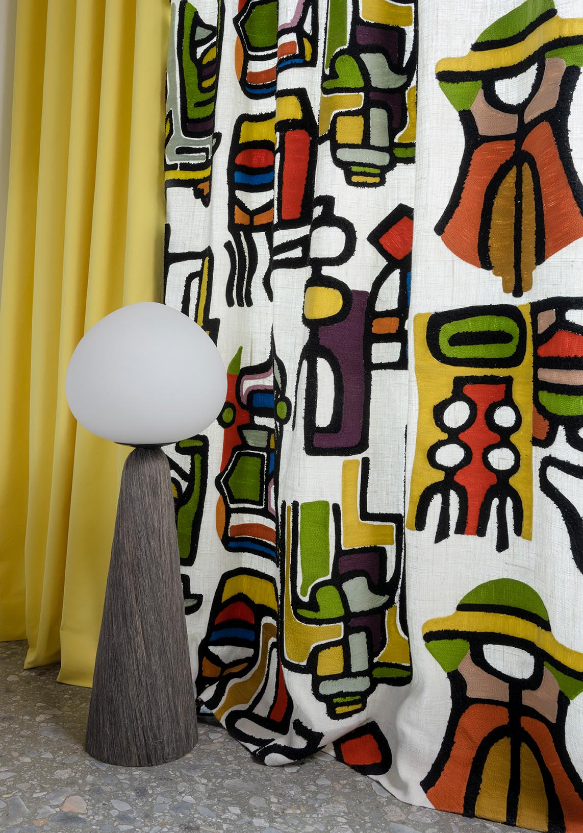 This beautiful embroidery on linen with rounded shapes and bright colours is a work of art in its own right. The balance between rhythm, material and space gives this fabric a unique language.