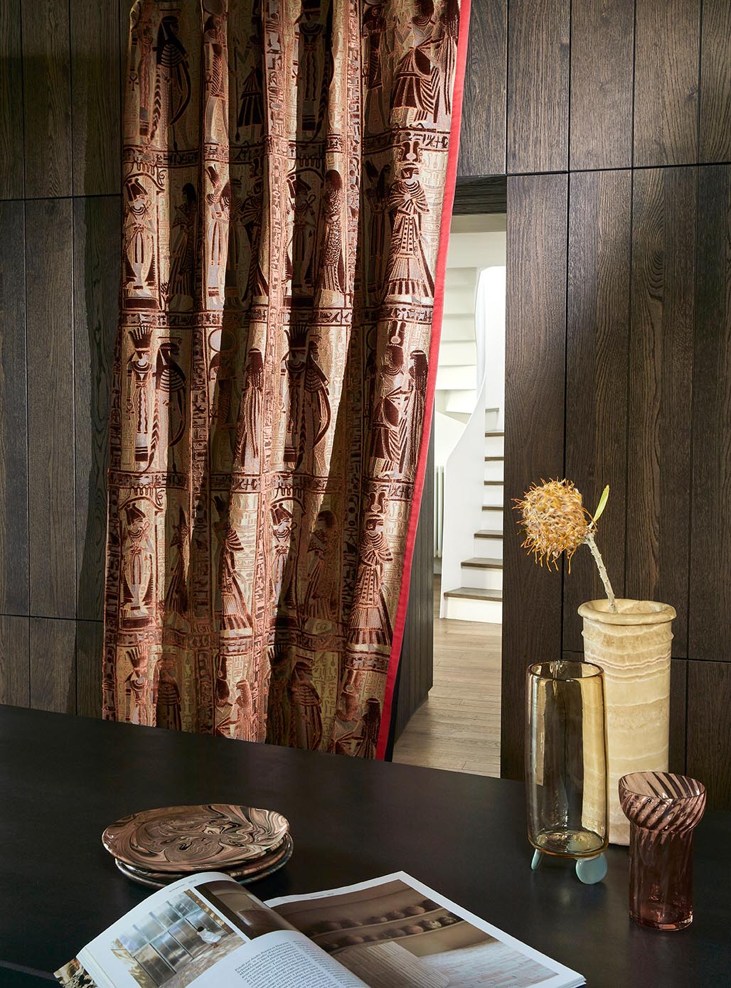 Working in partnership with the Louvre to celebrate, in particular, the bicentenary of the discovery of hieroglyphs by Champollion in 1822, the Maison Pierre Frey new collection displays a wide range of motifs and drawings, between faithful reproductions and free inspirations, with a respectful view of the preserved works but also a contemporary and graphic reading.