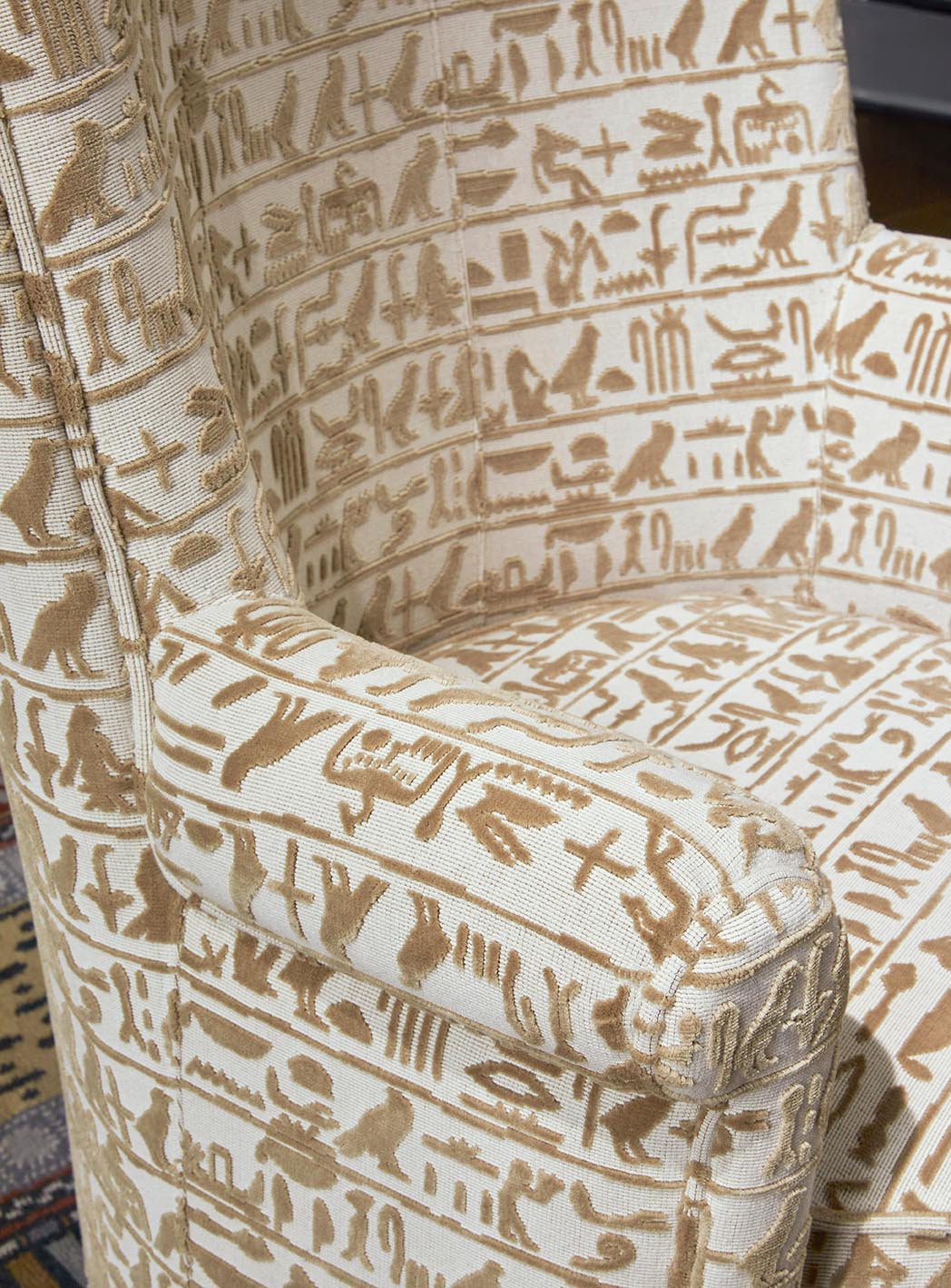 In carved cotton velvet, this free interpretation of hieroglyphs, a fragment of a stele, illustrates both the finesse and sophistication of a very aesthetic writing.