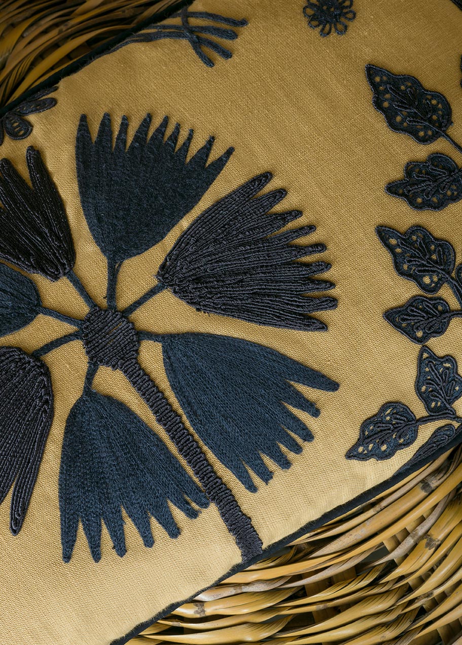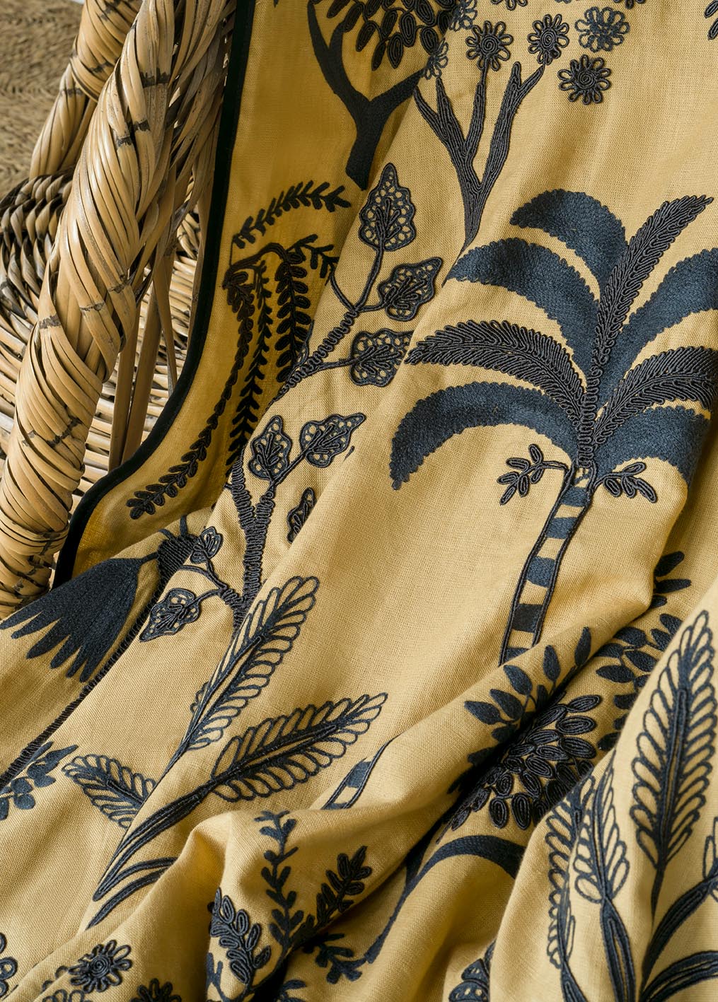 Collection of palm trees embroidered with silky guipé threads whose refinement contrasts with the natural colored linen background.