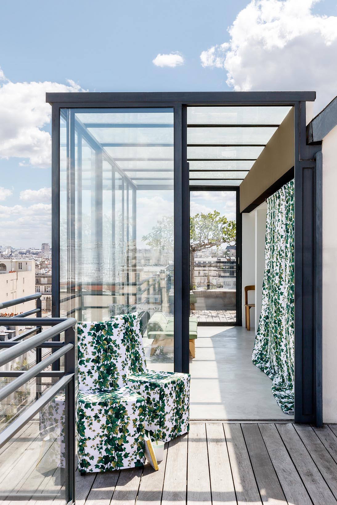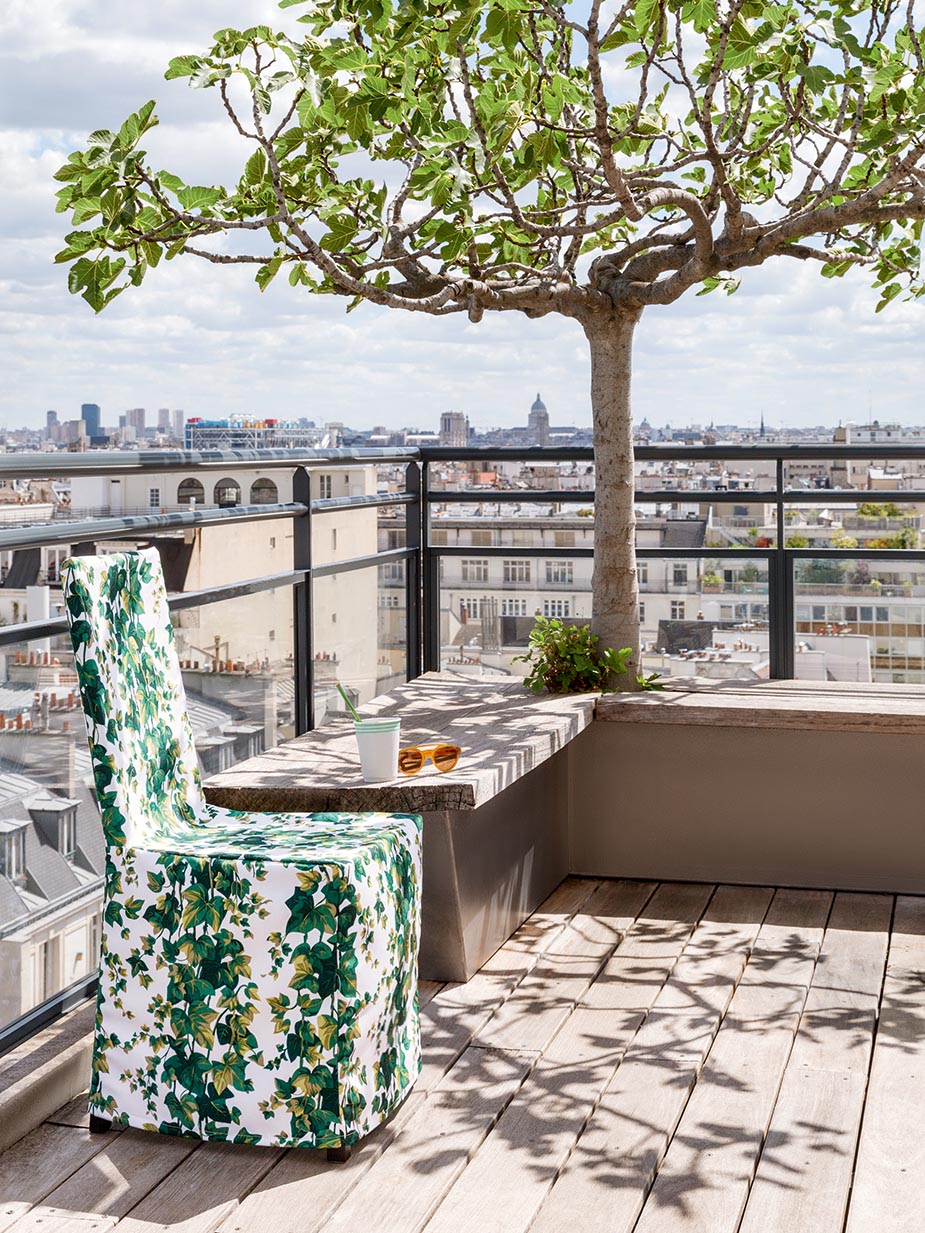 Imaginary charms of climbing ivy forming a stripe, this outdoor printed fabric recalls a pattern from the Boussac collection published in the 1970s in a bright and naturalist spirit. Outdoor and waterproof fabric.