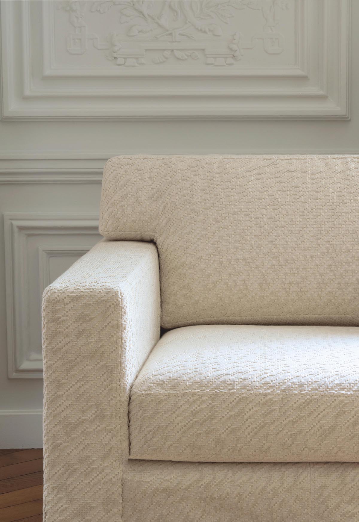 ZORA is an uncut velvet with a diagonal design from the Maison's archives. It has a charming monochromatic relief created by the contrast of its sophisticated cotton loops and the textured structure of its linen background.