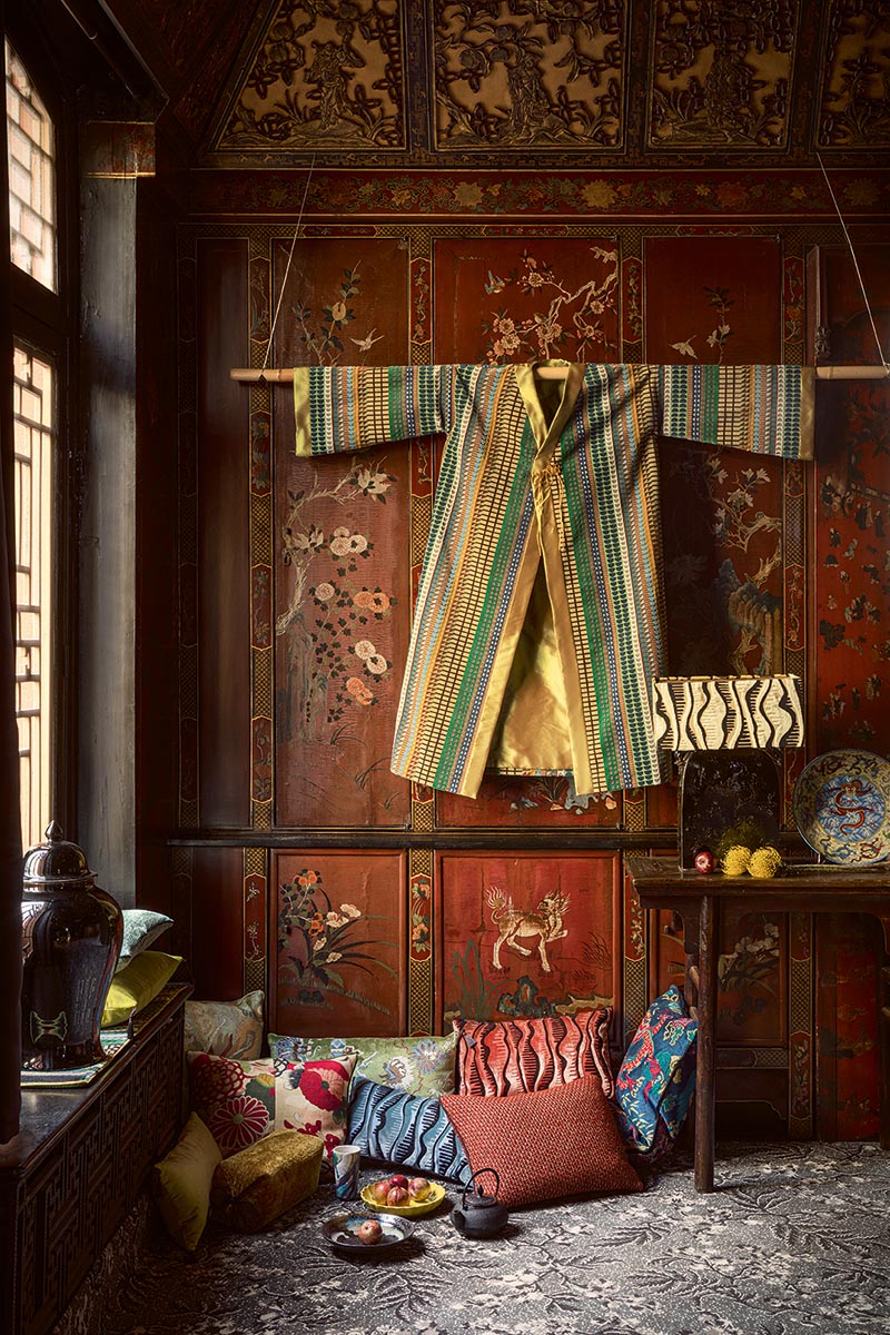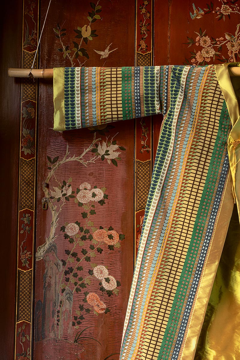 SOLEIL LEVANT! A name like a promise of elsewhere, the discovery of a thousand-year-old art, landscapes and a singular craft: the Far East. Driven by the spirit of Wabi-Sabi, between fullness and the traces of human activity, the collection revisits the real or imaginary bestiary of tigers and dragons of this land, Chinese porcelain, and the techniques and patterns of traditional Japanese or Tibetan clothing. It invites poetic escapism through the interplay of textures, inks, shapes and colours in subtle harmonies.