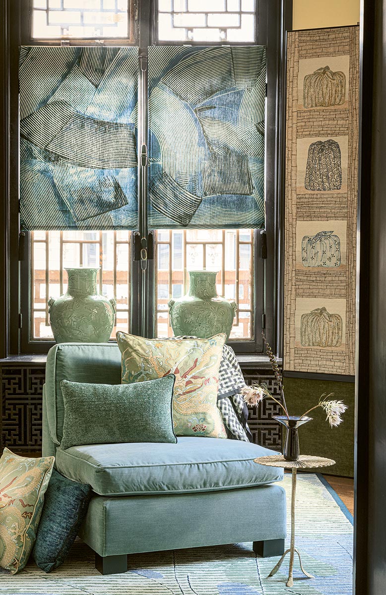 In a gradation of indigo blue, the vibrations of these brushstrokes printed on linen express an invigorating energy.
