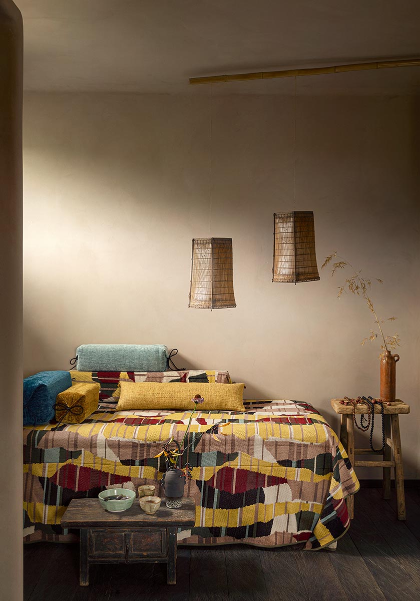 SOLEIL LEVANT! A name like a promise of elsewhere, the discovery of a thousand-year-old art, landscapes and a singular craft: the Far East. Driven by the spirit of Wabi-Sabi, between fullness and the traces of human activity, the collection revisits the real or imaginary bestiary of tigers and dragons of this land, Chinese porcelain, and the techniques and patterns of traditional Japanese or Tibetan clothing. It invites poetic escapism through the interplay of textures, inks, shapes and colours in subtle harmonies.