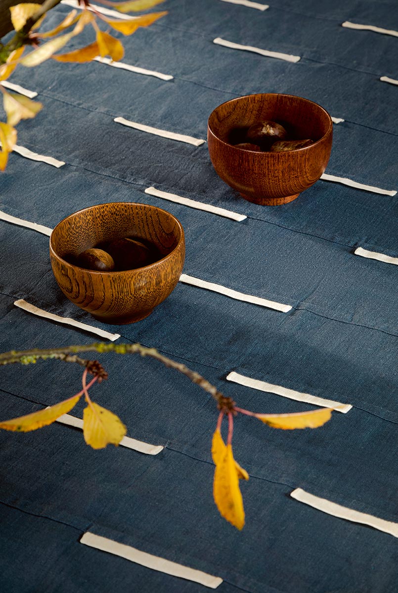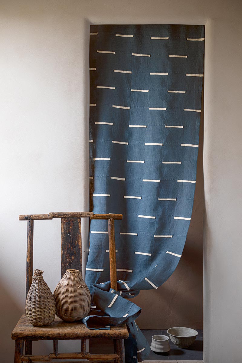 Inserted between wide strips of indigo linen like punctuation marks, thin, flattened, unbleached stripes punctuate this superb fabric.