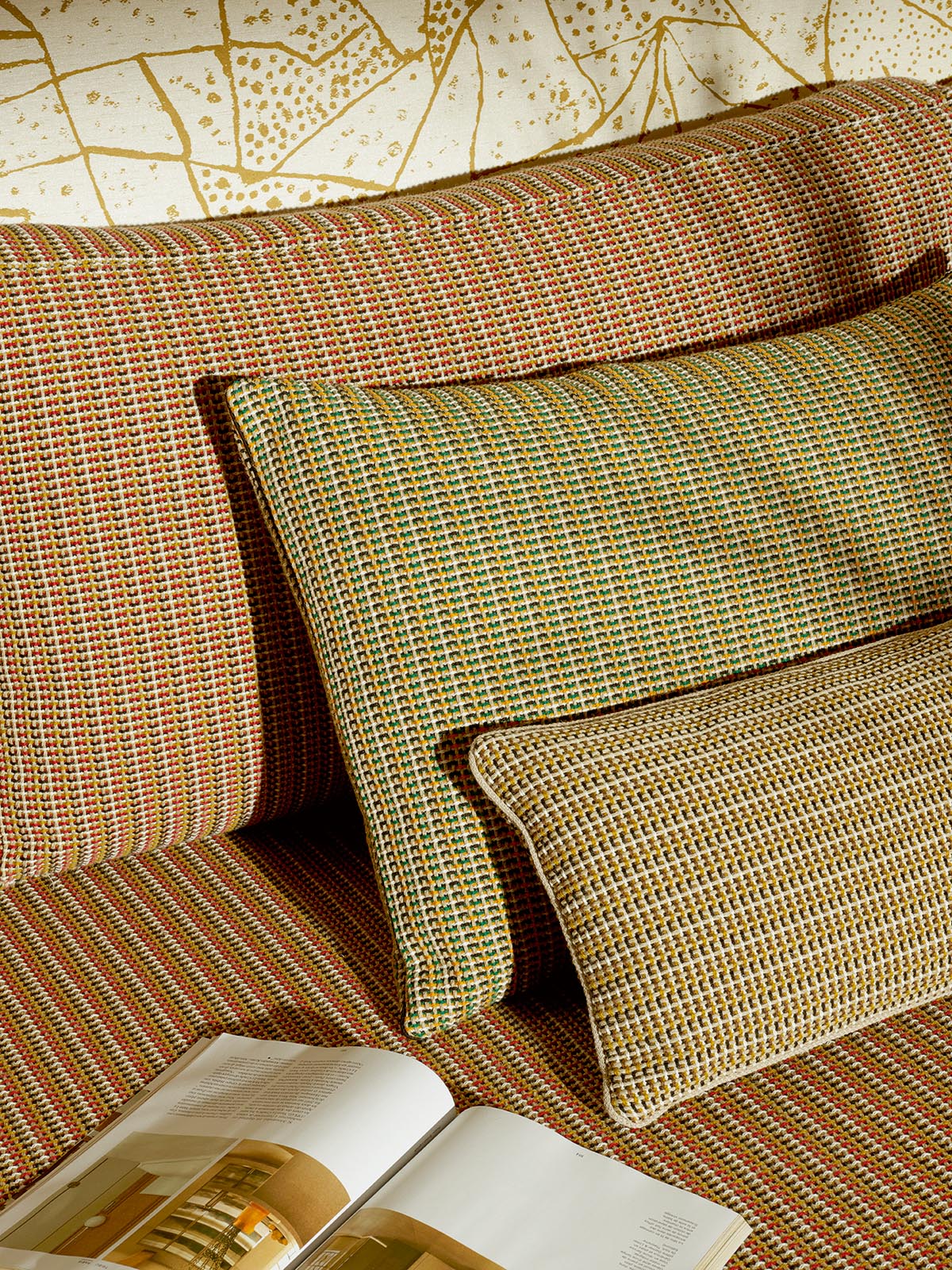 Woven in the Pierre Frey (EPV) workshops in northern France, this semi-plain fabric is recalls traditional weaving thanks to its thick linen weft and its play of cheerful, graphic colors.