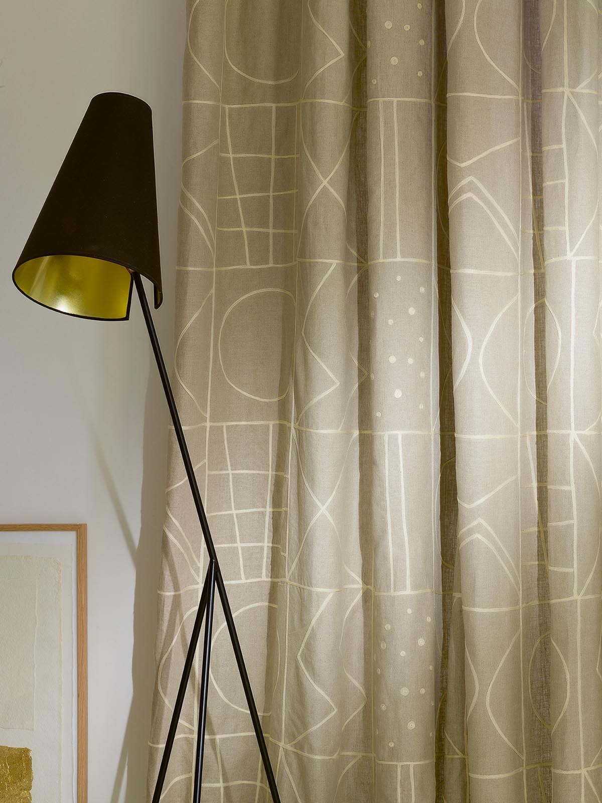 XXL scale for this geometric design on linen, drawn and embroidered by hand in chain stitch. Each tile reveals a different sketch: circles, squares or stripes, in the image of the artist's notebook.