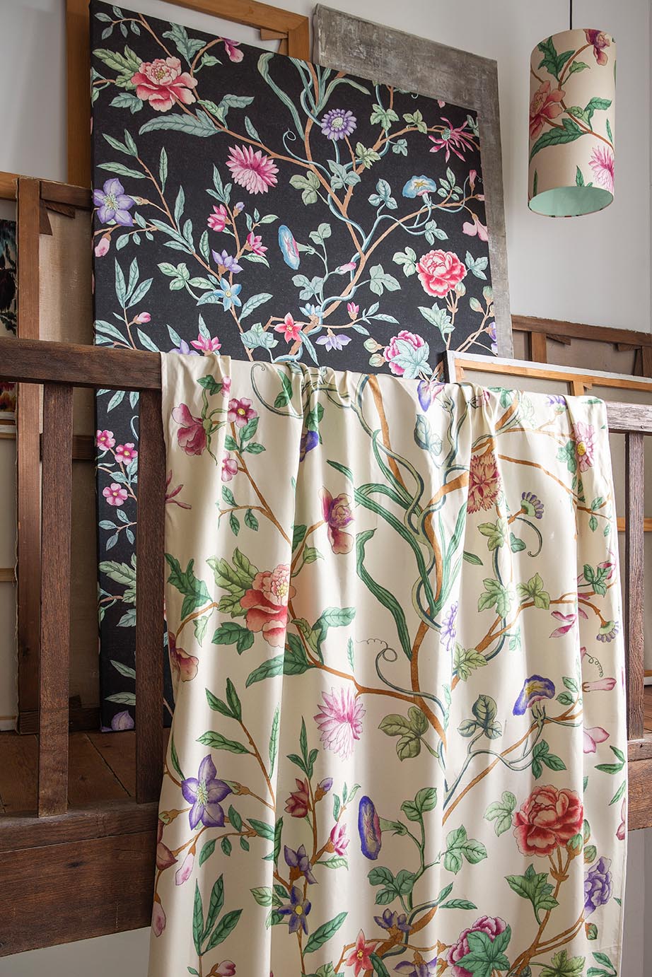 Magnificent print on union cloth , whose sinuous, flowering stem pattern is set free by an XXL scale, in deep, precious hues. SCEAUX evokes the fragility and elegance of nature. The floral motif is inspired by a Chinese painted silk that was very fashionable in the 18th century, a replica of which is preserved in the Maison's heritage collection.