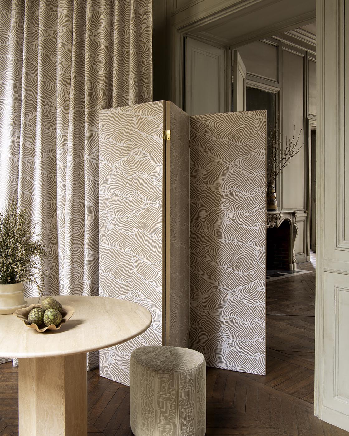 The Mongolian desert is evoked here with a simplified, abstract line. LA VALLÉE DES DRAGONS is flat screen printed on magnificent natural linen using a particularly opaque white pigment.