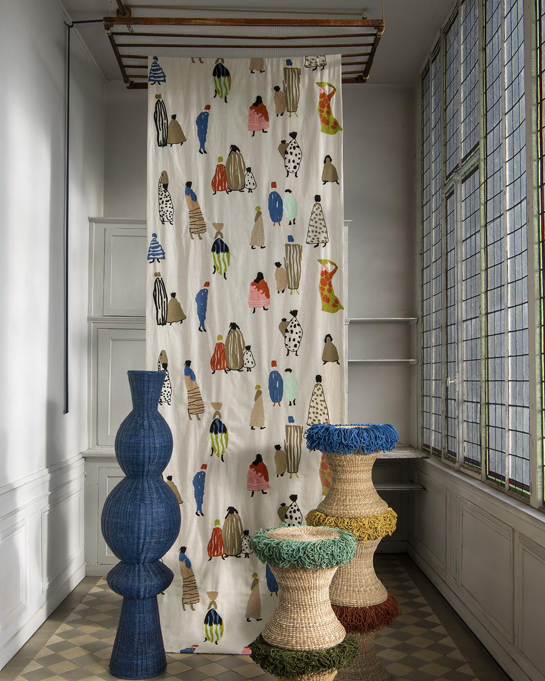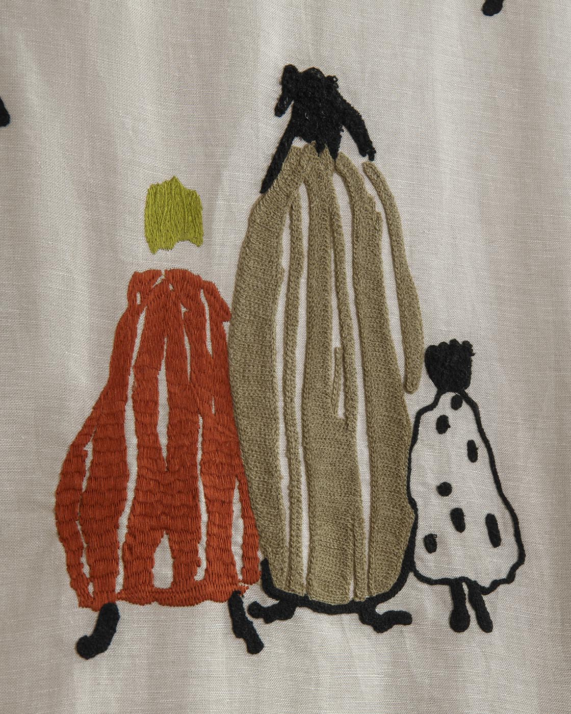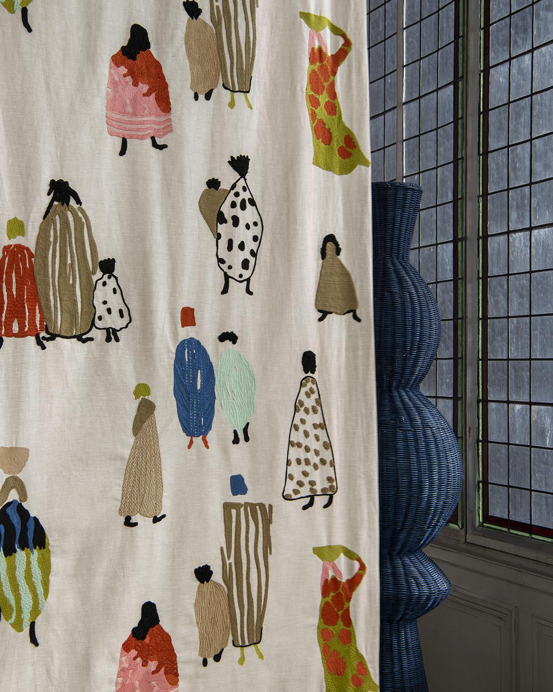 Large embroidery on linen with scattered silhouettes evoking desert nomads carrying jugs and wearing colourful clothes.