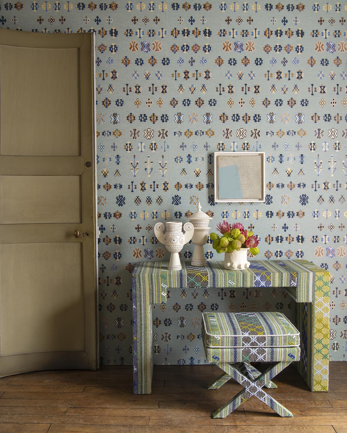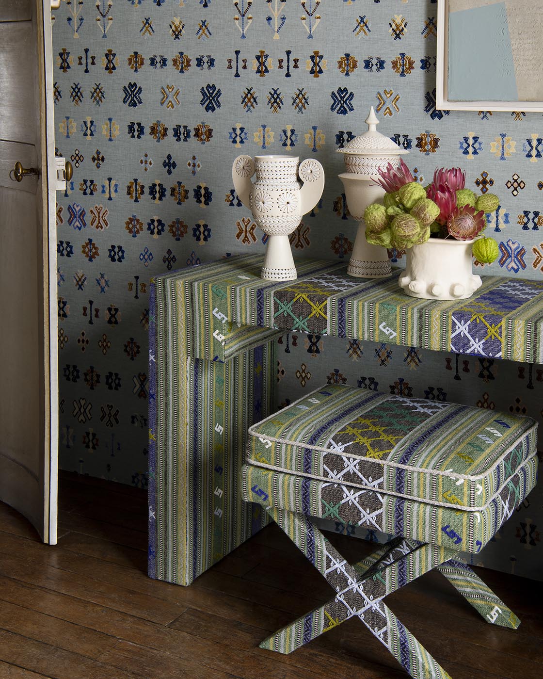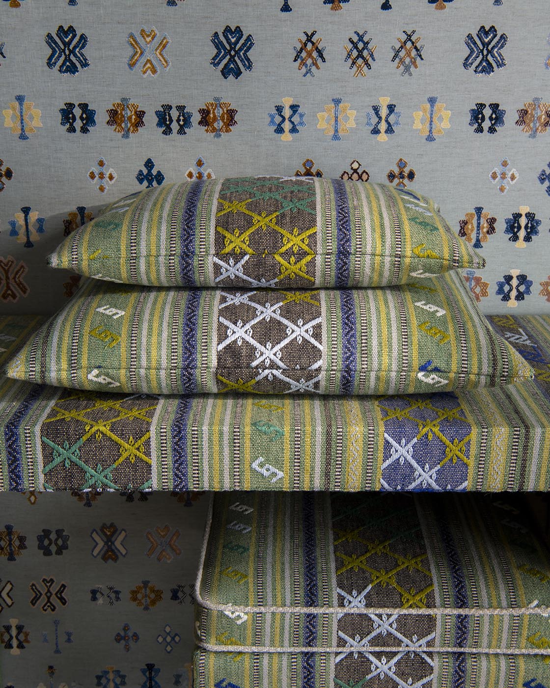 Inspired by a traditional Berber motif of kilim stripes, the HAMADA stripe is a faithful reinterpretation of one of the Maison's archives, in a magnificent embroidered jacquard.