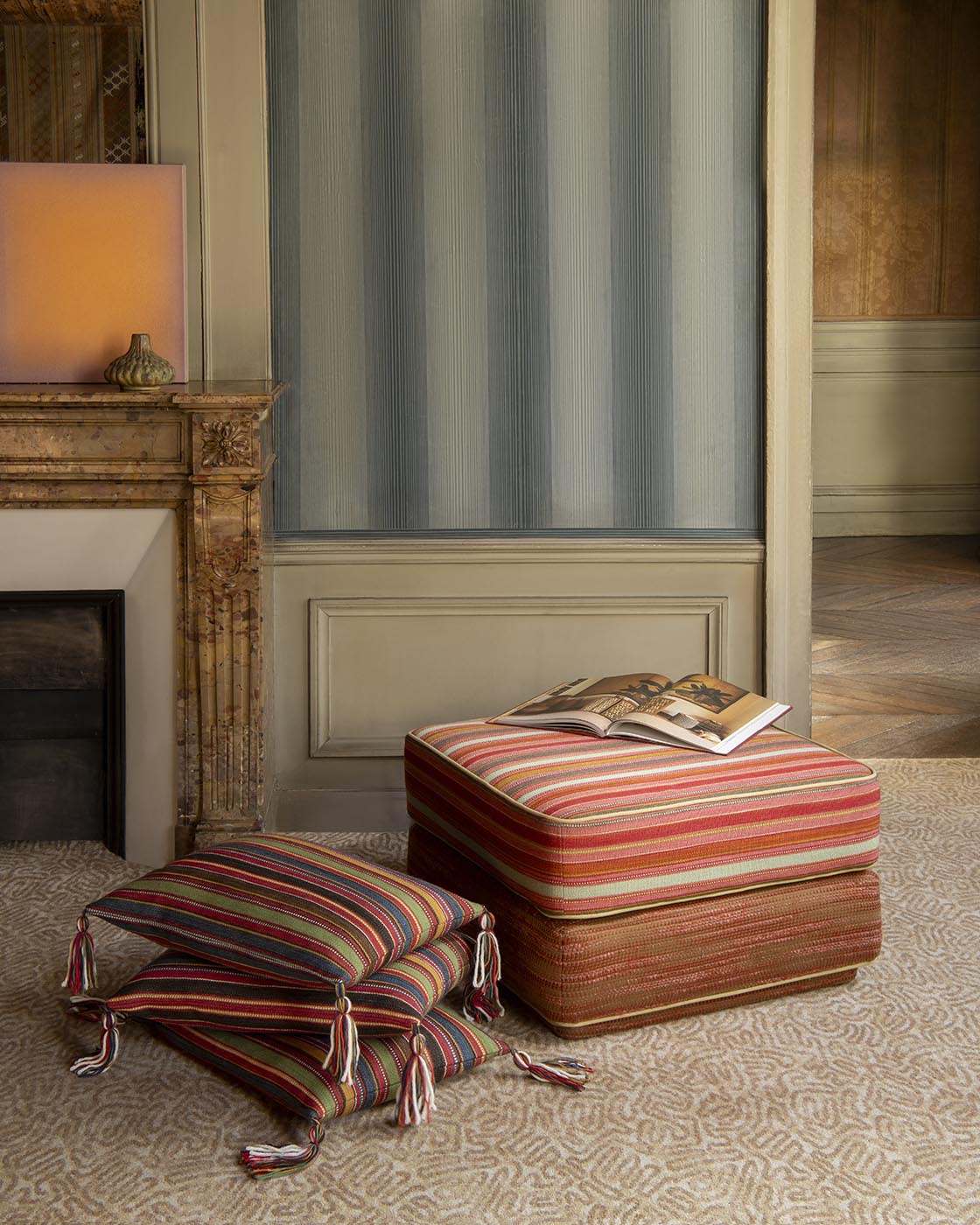Designed in collaboration with Richard Smith, this little kilim-inspired multicoloured bayadère stripe comes in two shades, one pastel, the other coordinating with RAYURE BIVOUAC F3958. Its supple, woolly hand gives it a warm, authentic character.