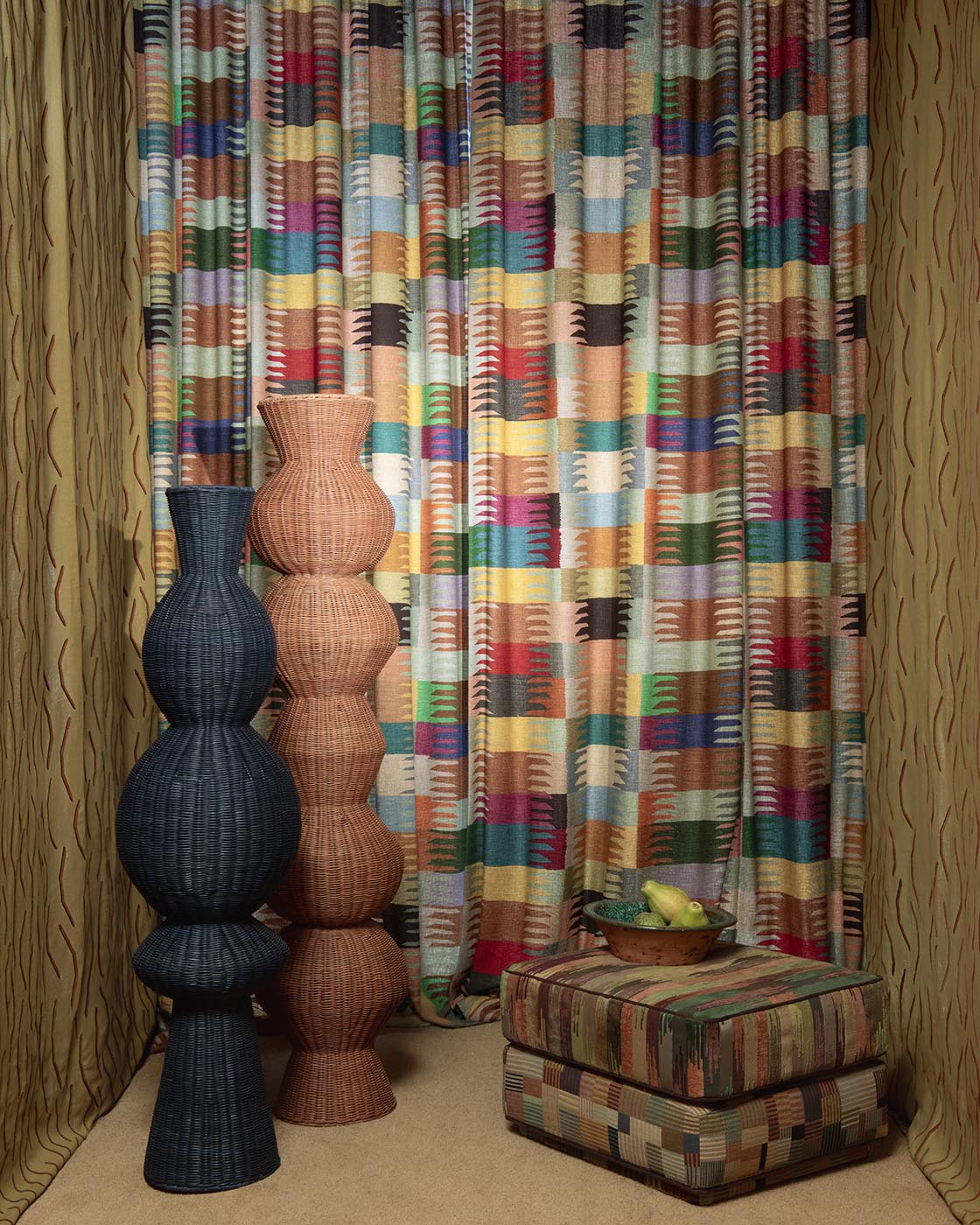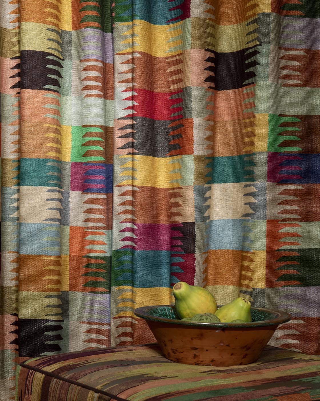 A magnificent multicoloured print on a linen-look background, TANAMI is a joyful ode to colour and ethnic and graphic patterns.