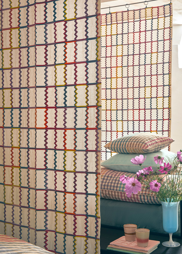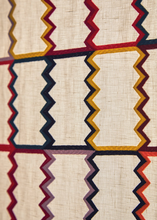 Graphic and colourful embroidery on linen, TACK TACK's resolutely dynamic line and warm, intense colours are an ode to Swedish design from the 70s.