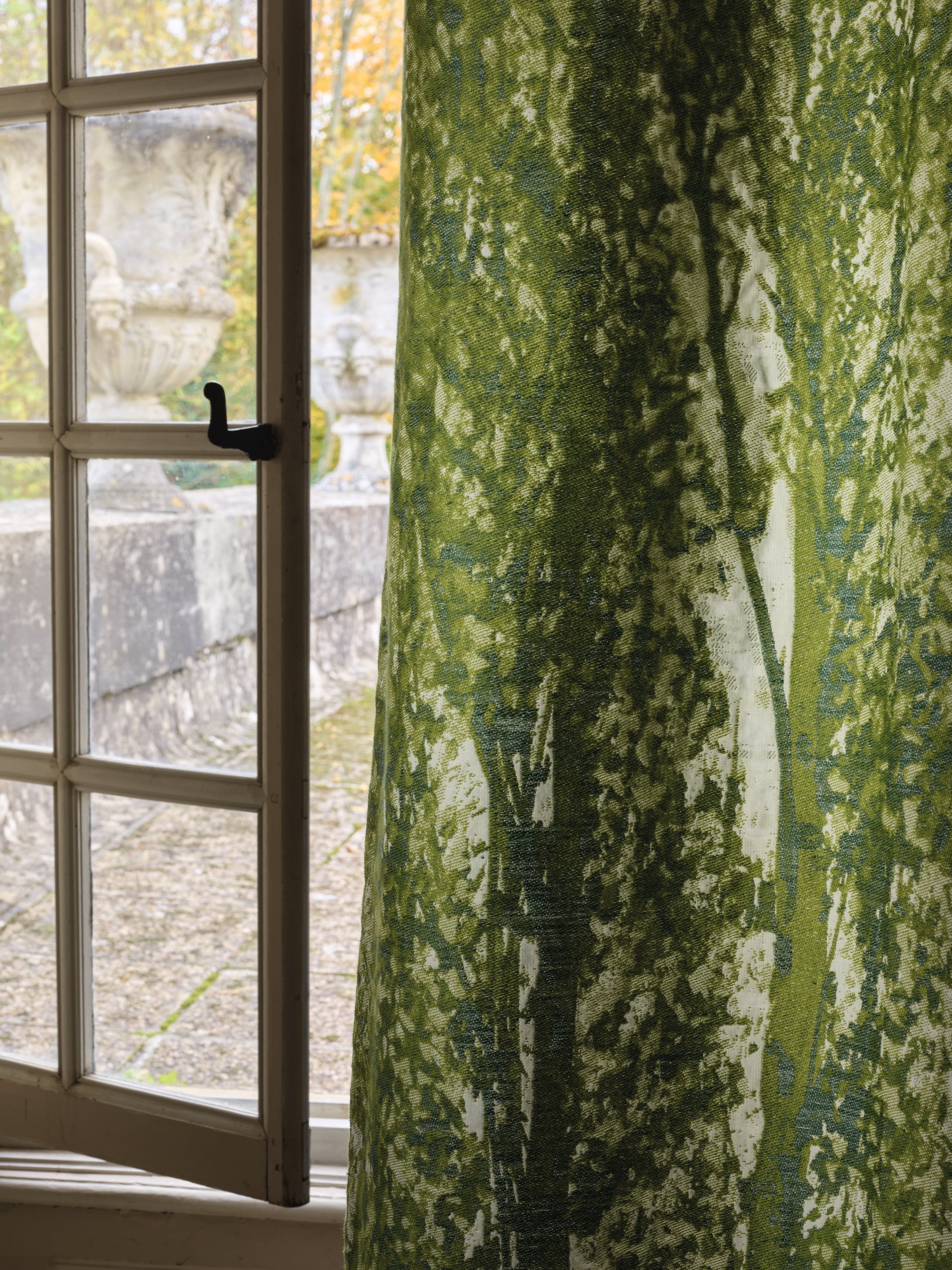 Jean-Luc Favéro draws and creates as naturally as he breathes! This artist with a capital A loves nothing more than painting in the great outdoors, using walnut stain on old second-hand books, depicting the lush landscapes of his native Aveyron. His works express all the exuberance and vitality of the vegetation of southern France. You can almost feel the sun shining through the tree leaves and hear the charming sound of streams and rivers. This extraordinary cotton and linen woven panel is produced in Pierre Frey's EPV-certified workshops in northern France. It features an XXL design of poplar trees in a powerful and joyful green colour. It can be joined together to create a continuous pattern, adding strength and character to the JARDIN À LA FRANÇAISE collection.