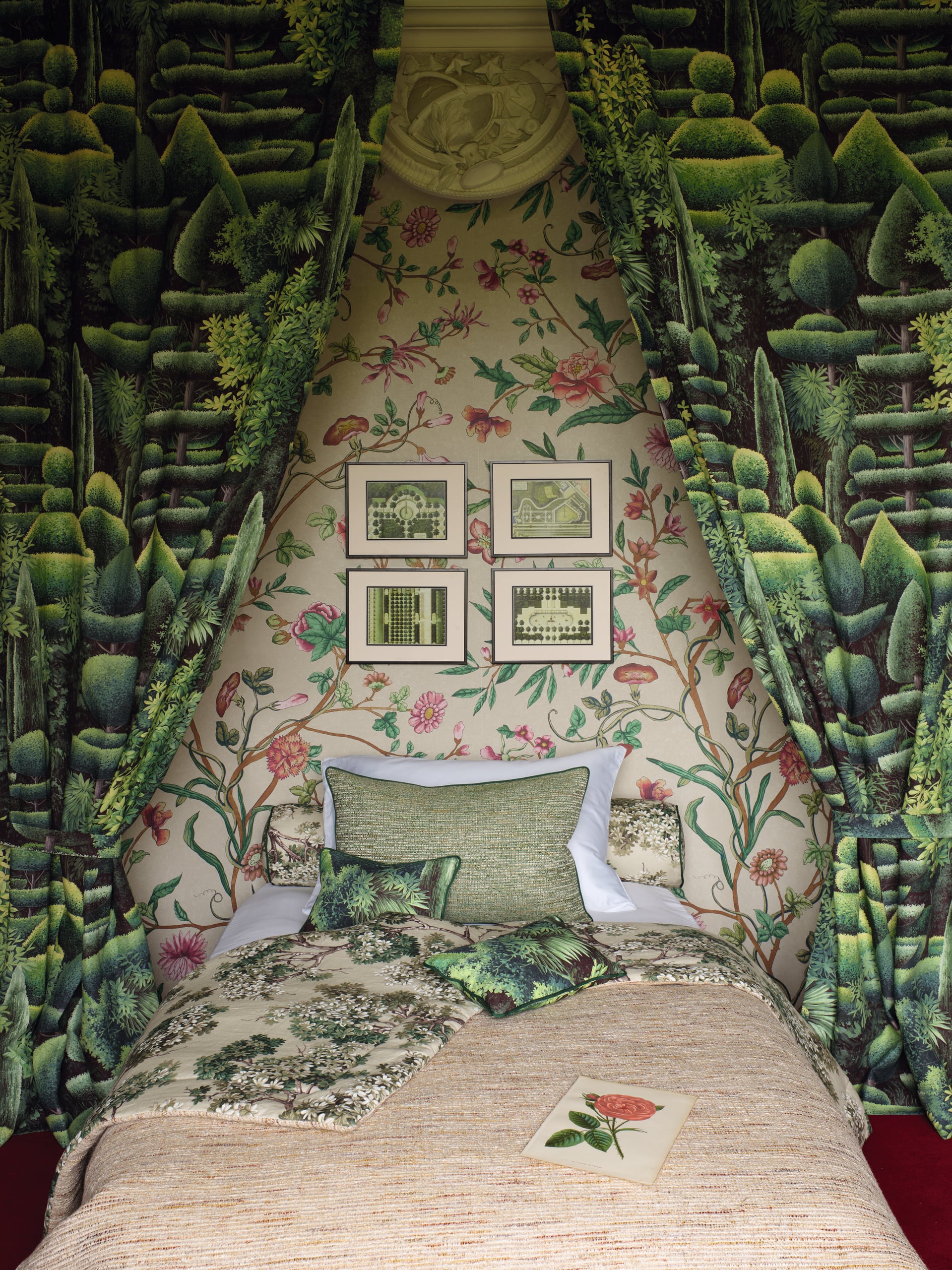 LES TOPIAIRES is a beautiful print on linen that skilfully illustrates the art of topiary found in many French gardens. The plant sculptures punctuate the wall with geometric shapes, an ode to the art of landscaping.