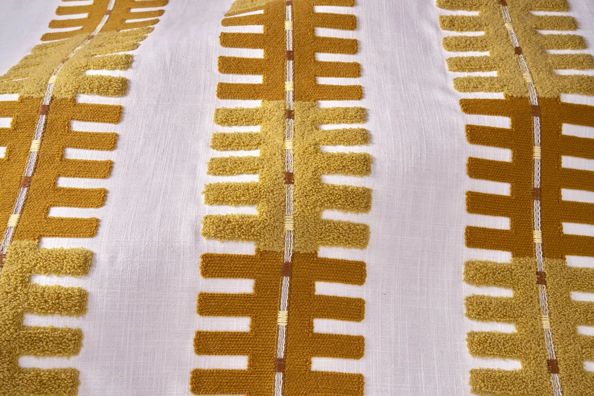 PÉGASE is a textured linen embroidery featuring an elegant geometric motif built in stripes, enhanced with covered yarns that lend a subtle sheen.