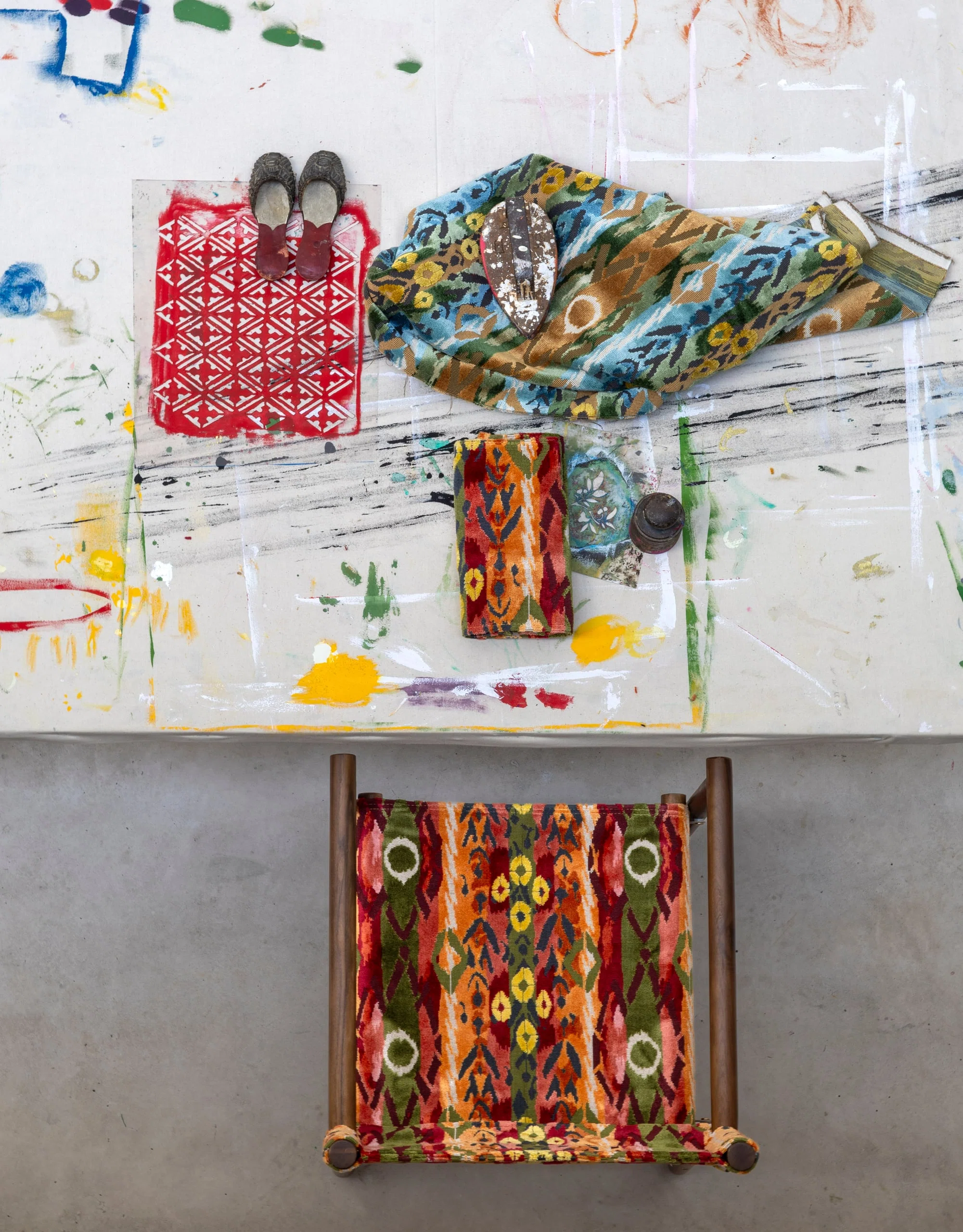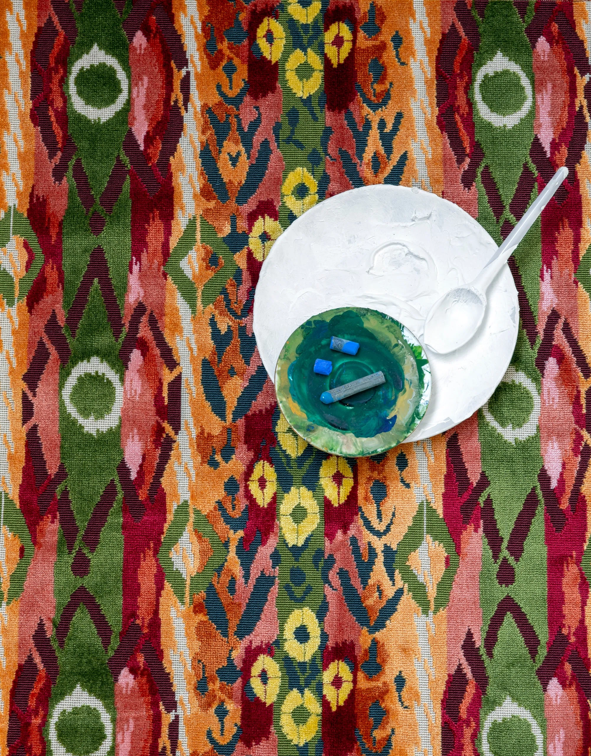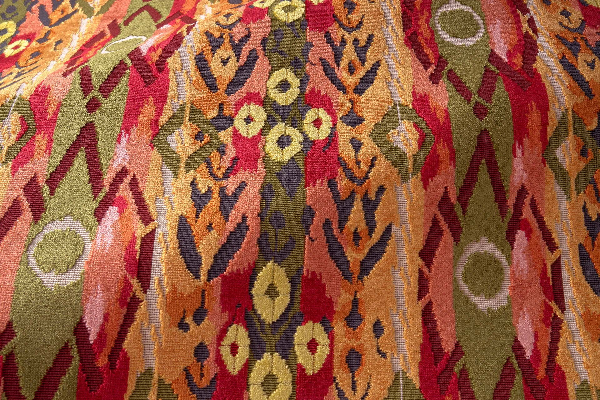 Like those large scarves that you drape over your shoulders and which bring a black and white dress to life. This design also marks the beginning of a great story in costume design, built around a dozen colourless dresses. One day, Isabelle de Borchgrave placed this coloured paper shawl on a bust, and the whole story of Frida Kahlo began. Today, MACAO is a magnificent, thick, supple, ciselé velvet in bright, deep colours.