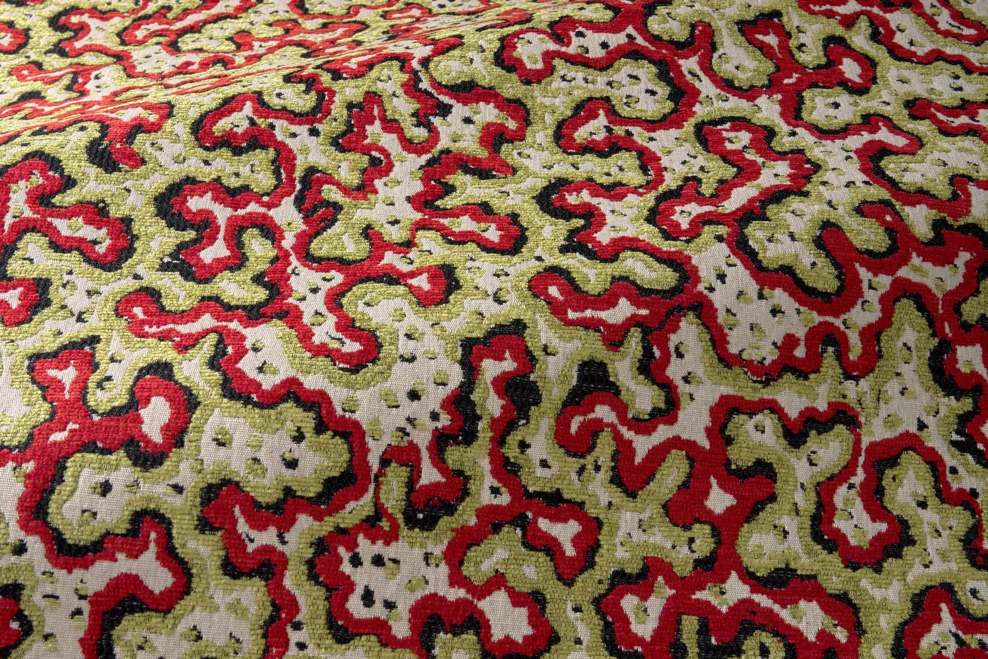 A motif reminiscent of moss seen up close, of seaweed, a vegetal world that Isabelle de Borchgrave is particularly fond of. It is a pattern between abstraction and nature: the density creates a living, almost tactile material. A fabric of life, painted with instinct and finesse. Its adaptation into a jacquard combining natural materials and chenille perfectly captures this organic and intense spirit. A quality particularly suited for seating use.